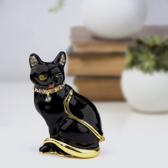 品名:招福辟邪黑貓用途:擺飾品,置放戒指.耳環等小物品材質:鉛錫合金.水晶.釉料注意事項:請小心輕放尺寸:約4.2x3x6.5cm