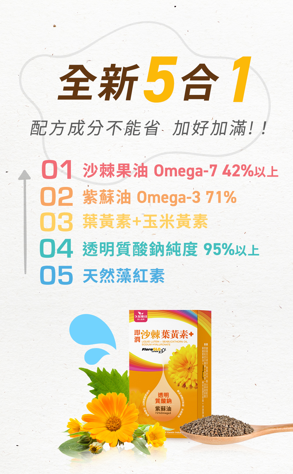 品名:【久保雅司】紫蘇沙棘玻尿酸葉黃素超級有感5盒組商品重(容)量:500mg/粒、30粒/盒,共5盒內容物(成分):紫蘇油、沙棘果油、葉黃素20%(紅花籽油、金盞花抽取物、生育醇(維生素E)、藻油(葵花油、紅藻華取物(含蝦紅素)、維生素E(抗氧化劑)、Hyabest®流行鏈球菌發酵物(含透明質酸鈉)、軟膠囊(明膠、水、甘油、二氧化鈦、食用紅色六號、食用黃色四號、食用藍色一號)195mg食用方式:每日1粒保存期限:2年