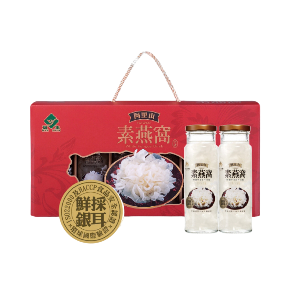品名:【萬生生機】阿里山素燕窩6入禮盒組商品成分:水、銀耳、冰糖內容量:230公克 固形量:107公克食用方法:開罐即飲 保存期限:18個月(未開封)有效日期:標示於瓶蓋(日.月.年)保存方式:存於陰涼處產地:臺灣 營養標示:每一份量230公克/本包裝含6份營養成份:熱量60.7大卡/蛋白質0公克/脂肪0公克/飽和脂肪0公克/反式脂肪0公克/碳水化合物15.2公克/糖12.9公克/鈉14.5毫克