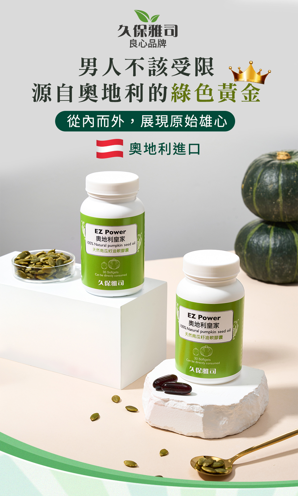 商品: 【奧地利皇家】100%天然南瓜籽油軟膠囊4瓶組內容物(重量):1280mg/粒;30粒/瓶 ,共4瓶內容物(成分):天然南瓜籽油、膠囊(明膠、甘油、水) 保存方法:置於陰涼乾燥處,孩童不易取得之處。 食用方式:每天睡前:保養1粒、加強兩粒。 保存期限:3年食品業者登錄字號:E-180492409-00000-8