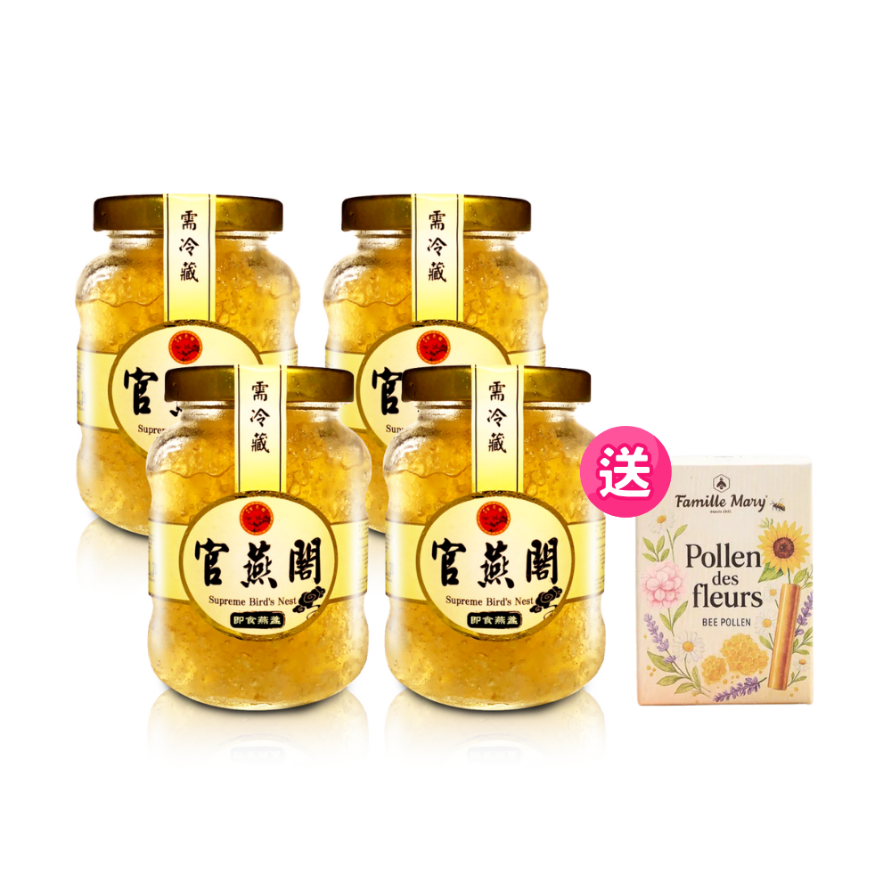 規格:現燉頂級燕窩200G/瓶(固形物200G)x4瓶、法國瑪莉家族香檳區鮮採花粉2gx15包/盒