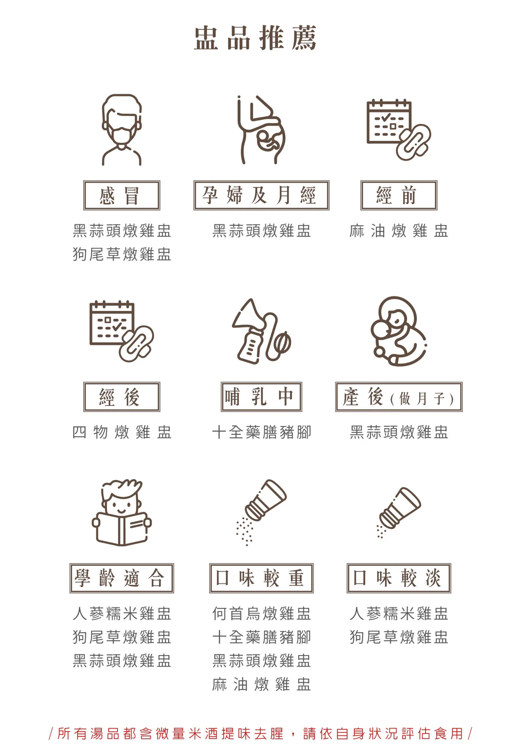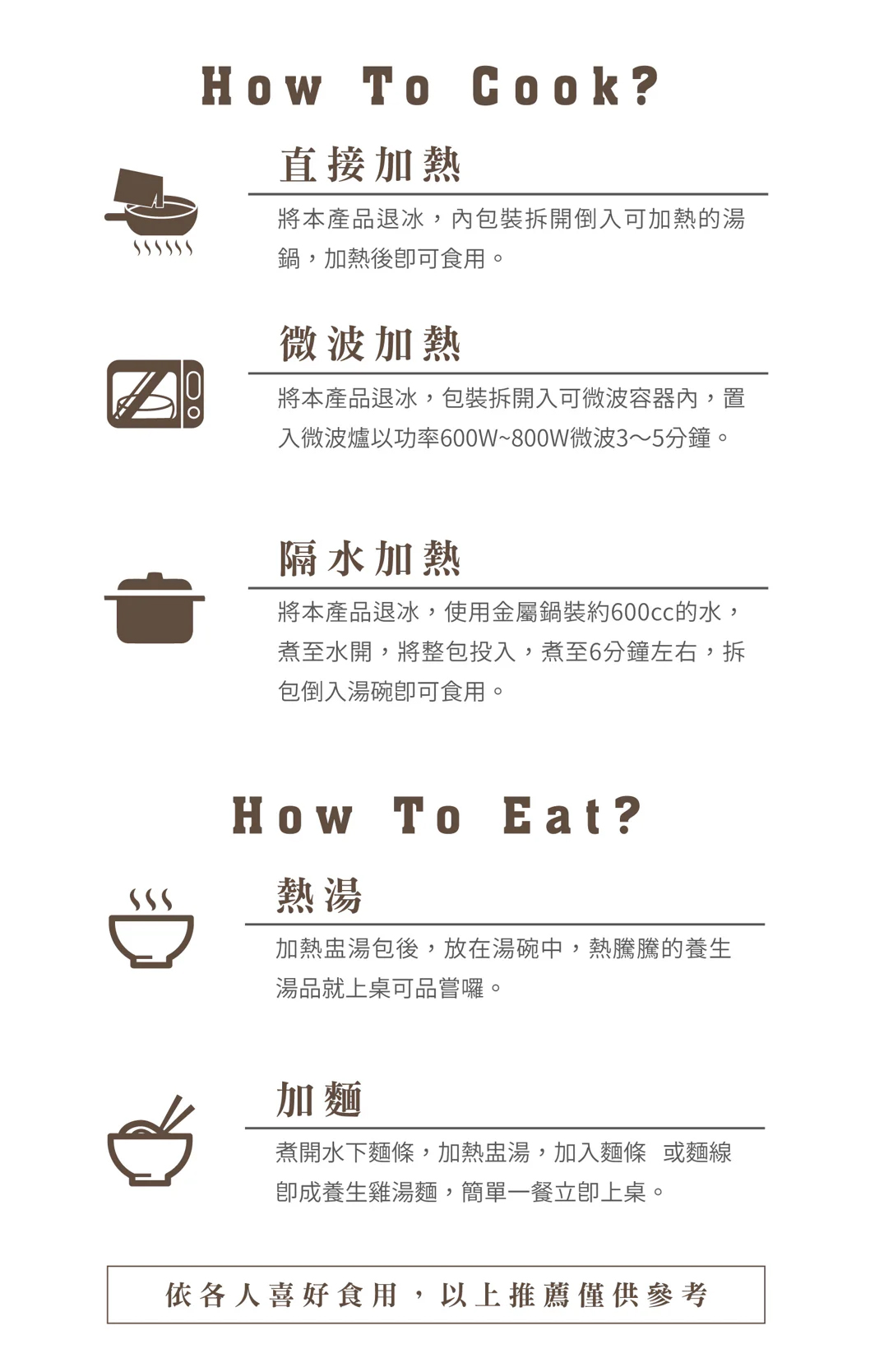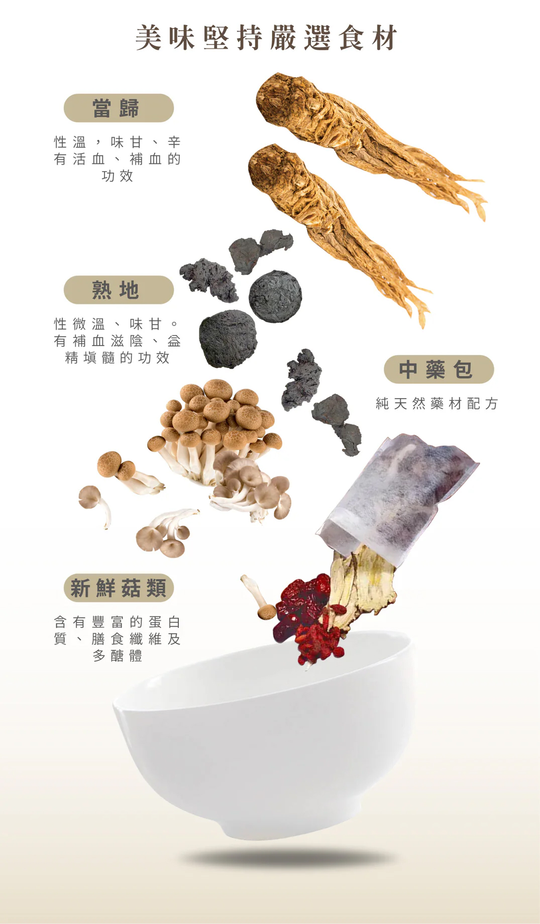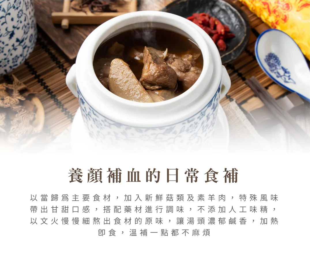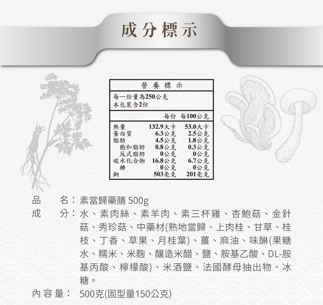 品名:【唐太盅】素當歸藥膳盅單包規格:500g/包(固型量150g)成分:水、素肉絲、素羊肉、素三杯雞、杏鮑菇、金針菇、秀珍菇、中藥材(熟地當歸、上肉桂、甘草、桂枝、丁香、草果、月桂葉)、薑、麻油、味醂(果糖水、糯米、米麴、釀造米醋、鹽、胺基乙酸、DL-胺基丙酸、檸檬酸)、米酒、鹽、法國酵母抽出物、冰糖。產地:台灣保存期限:冷凍1年,冷藏1週(依照產品有限日期)保存方法:冷凍-18度c食用方法:本產品需解凍,外袋為耐熱材質,並經檢驗合格