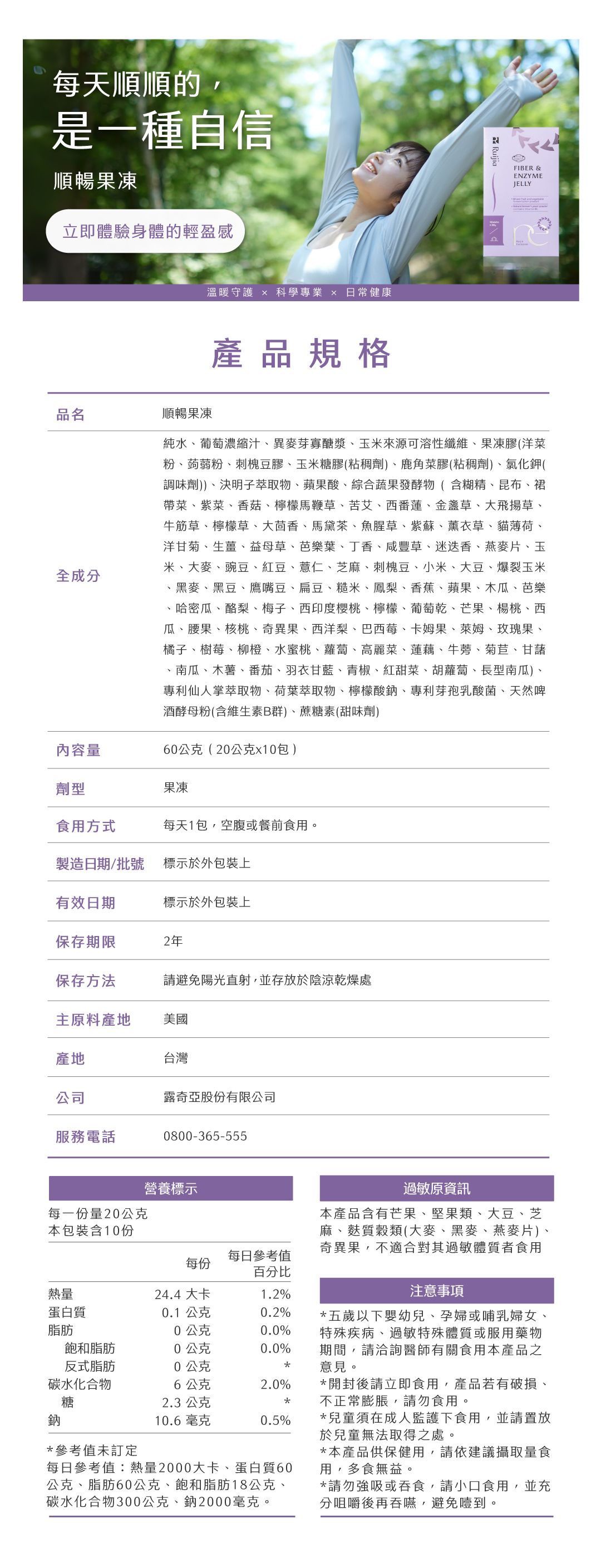 內容物:純水、葡萄濃縮汁、異麥芽寡醣漿、玉米來源可溶性纖維、果凍膠(洋菜粉、蒟蒻粉、刺槐豆膠、玉米糖膠(粘稠劑)、鹿角菜膠(粘稠劑)、氯化鉀(調味劑))、決明子萃取物、蘋果酸、綜合蔬果發酵物(含糊精、昆布、裙帶菜、紫菜、香菇、檸檬馬鞭草、苦艾、西番蓮、金盞草、大飛揚草、牛筋草、檸檬草、大茴香、馬黛茶、魚腥草、紫蘇、薰衣草、貓薄荷、洋甘菊、生薑、益母草、芭樂葉、丁香、咸豐草、迷迭香、燕麥片、玉米、大麥、豌豆、紅豆、薏仁、芝麻、刺槐豆、小米、大豆、爆裂玉米、黑麥、黑豆、鷹嘴豆、扁豆、糙米、鳳梨、香蕉、蘋果、木瓜、芭樂、哈密瓜、酪梨、梅子、西印度櫻桃、檸檬、葡萄乾、芒果、楊桃、西瓜、腰果、核桃、奇異果、西洋梨、巴西莓、卡姆果、萊、玫瑰果、橘子、樹莓、柳橙、水蜜桃、蘿蔔、高麗菜、蓮藕、牛蒡、菊苣、甘藷、南瓜、木薯、番茄、羽衣甘藍、青椒、紅甜菜、胡蘿蔔、長型南瓜)、專利仙人掌萃取物、荷葉萃取物、檸檬酸鈉、專利芽孢乳酸菌、天然啤酒酵母粉(含維生素B群)、蔗糖素(甜味劑)