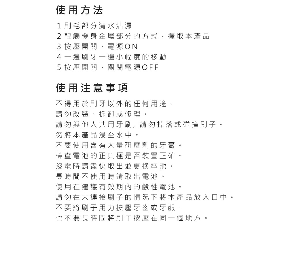 内容:牙刷主機*1+電池*1+刷頭*2(含機身上)