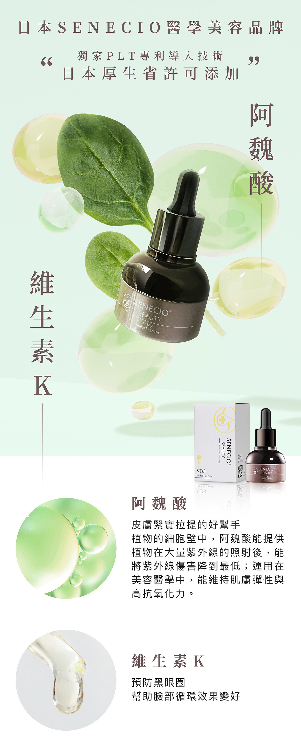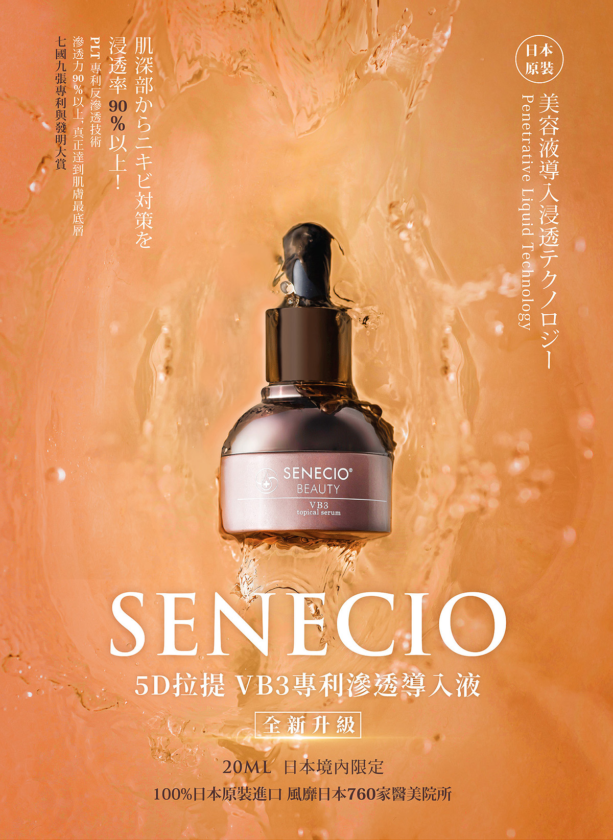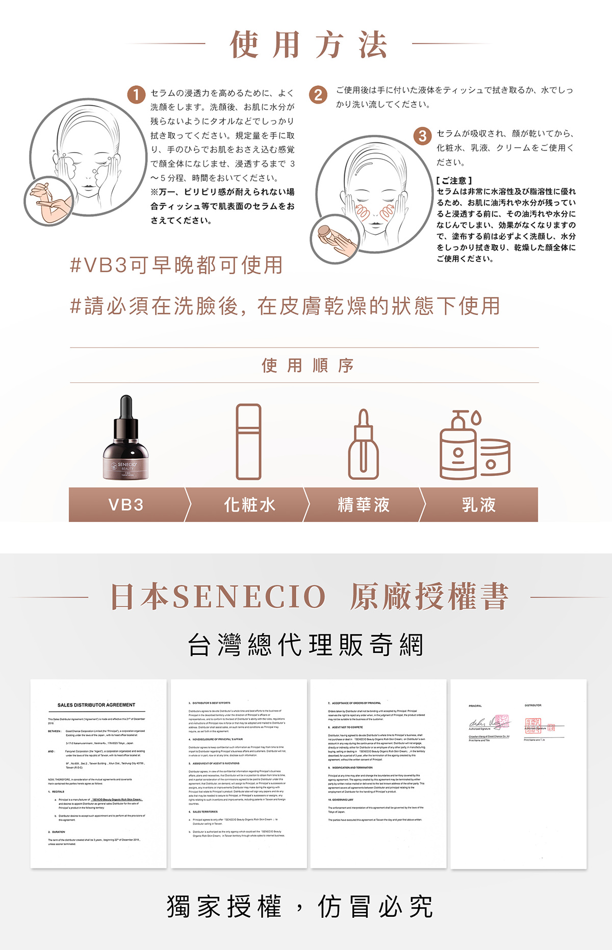 品名:【SENECIO】5D拉提VB3專利抗老導入液3瓶組(日本淨膚加強)規格:20ml/瓶,共3瓶使用方法:請依照規定的使用量取出於手掌後,輕輕的塗抹在整體臉部後,請等待3~5分鐘讓導入液完全滲透。注意:為了提升導入液的滲透效果,請先清洗臉部。清洗完臉部後,請使用毛巾擦乾臉部,不要讓任何水分殘留在臉部上。一天使用量請以4滴為上限。
