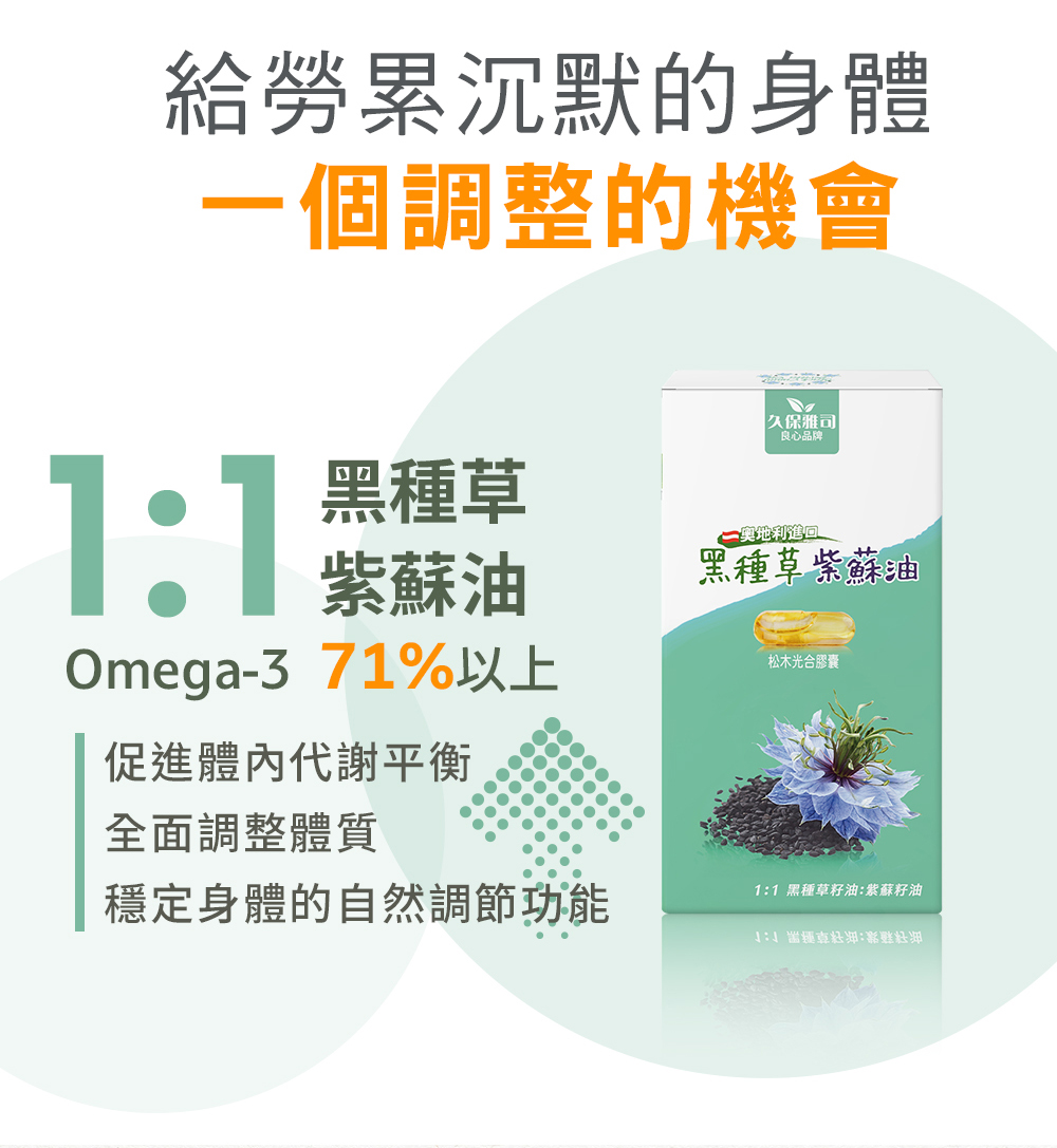 品名:【久保雅司】黑種草紫蘇油膠囊4盒組規格:30顆/盒,共4盒成分:黑種草籽油250mg,紫蘇籽油250mg膠囊成分:羥丙基甲基纖維素、純水、鹿角菜膠、氯化鉀 *植物膠囊中的羥丙基甲基纖維素來源為松木食用方法:一次一顆,加強保養2顆產品批號/有效日期:詳見包裝標示產地:台灣 黑種草籽油產地:奧地利進口 紫蘇籽油產地:韓國進口保存期限:2年保存方法:因台灣氣候潮濕,鋁袋開封後,請保持乾燥陰涼及兒童不易取得處,避免陽光直射