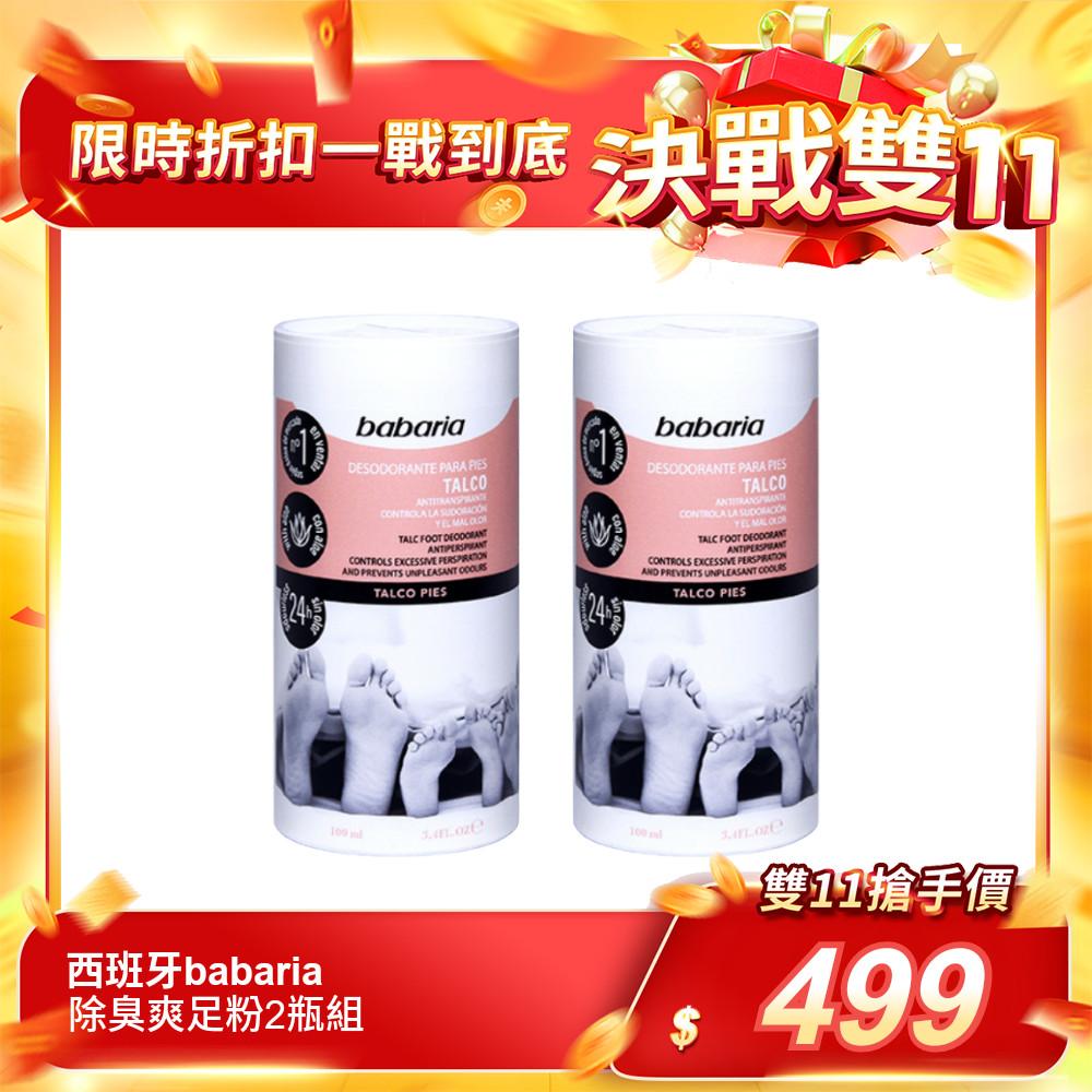 品名:【西班牙babaria】除臭爽足粉2瓶組規格:100ml/瓶,共2瓶成分:依外包裝標示為主使用方式:潔淨雙足後,取適量爽足粉塗抹腳掌與指縫,鞋襪也可少量使用。產地:西班牙