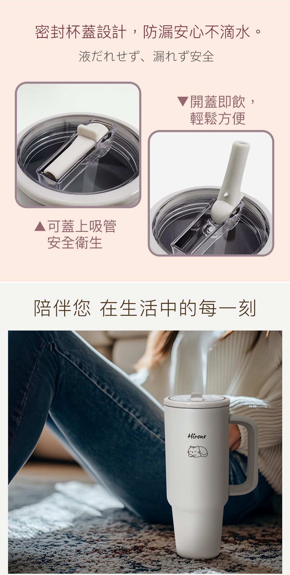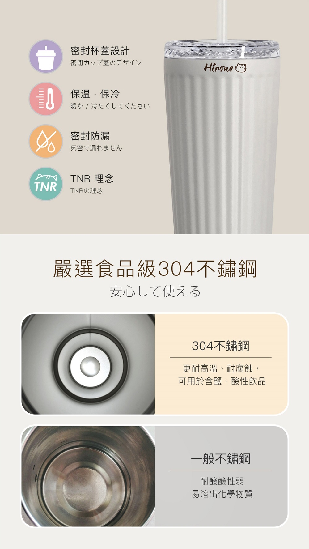 材 質:杯體304不鏽鋼 / 杯蓋PP(聚丙烯)、PS(聚苯乙烯)、TPE、矽膠 / 吸管PP(聚丙烯)