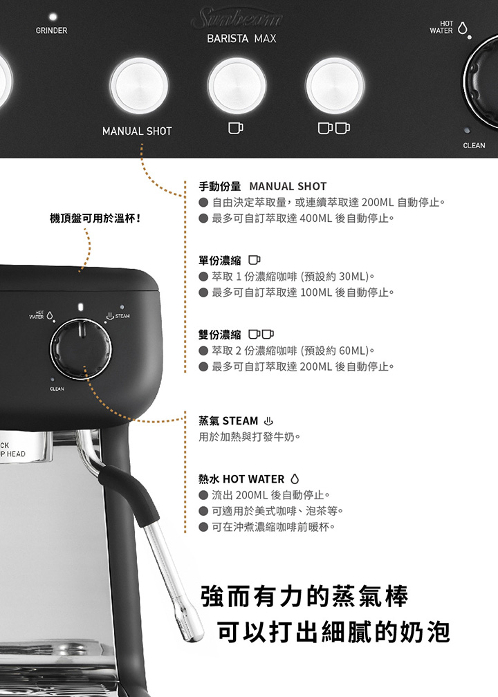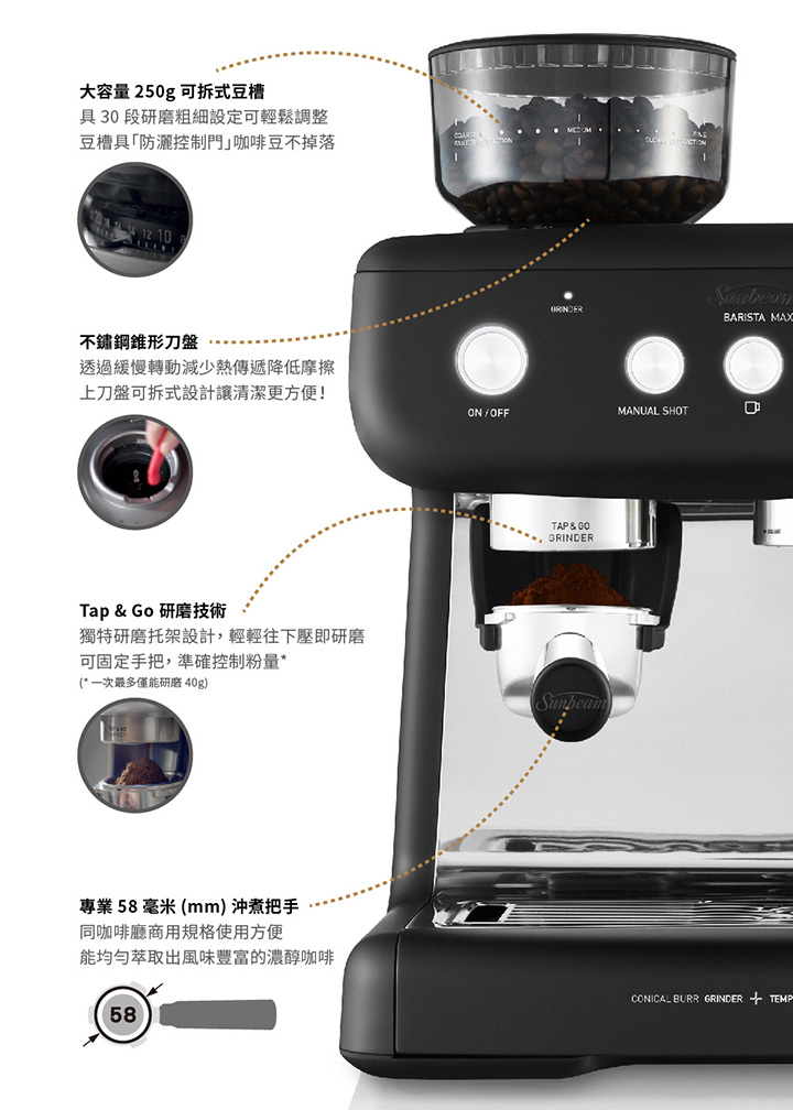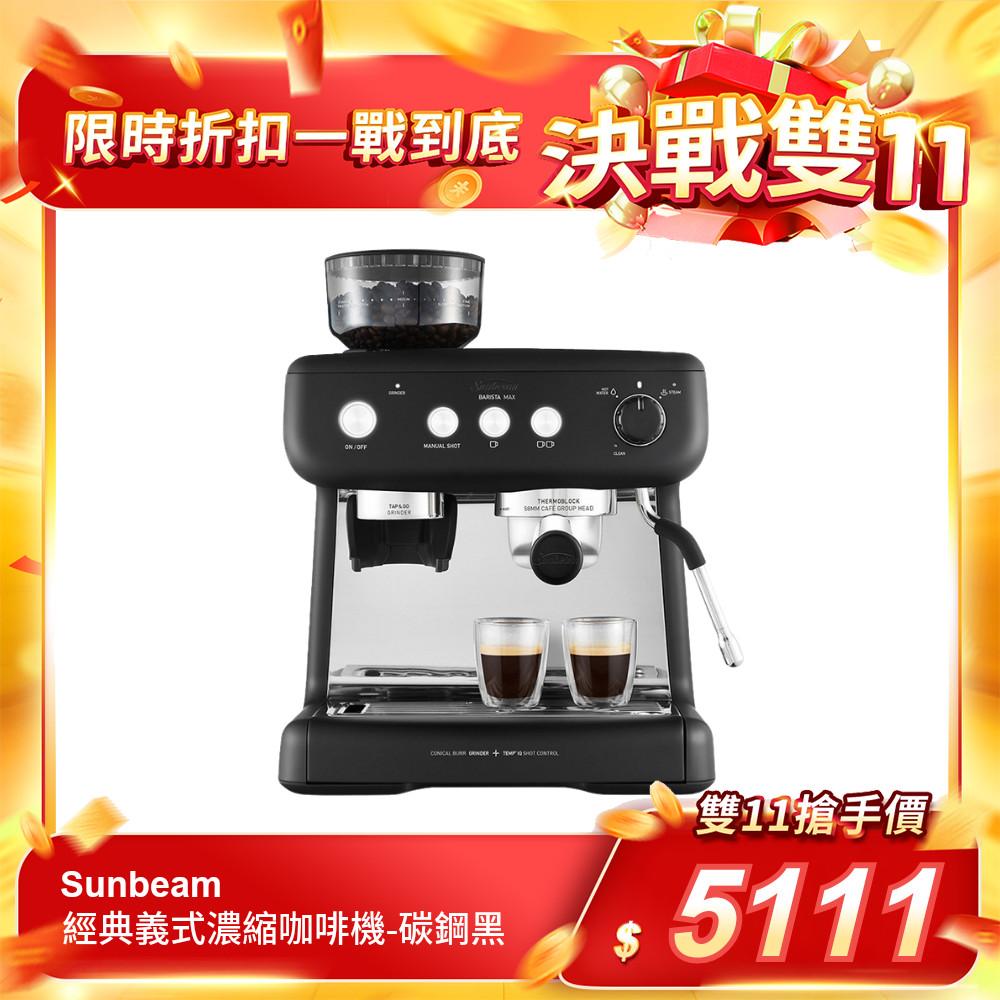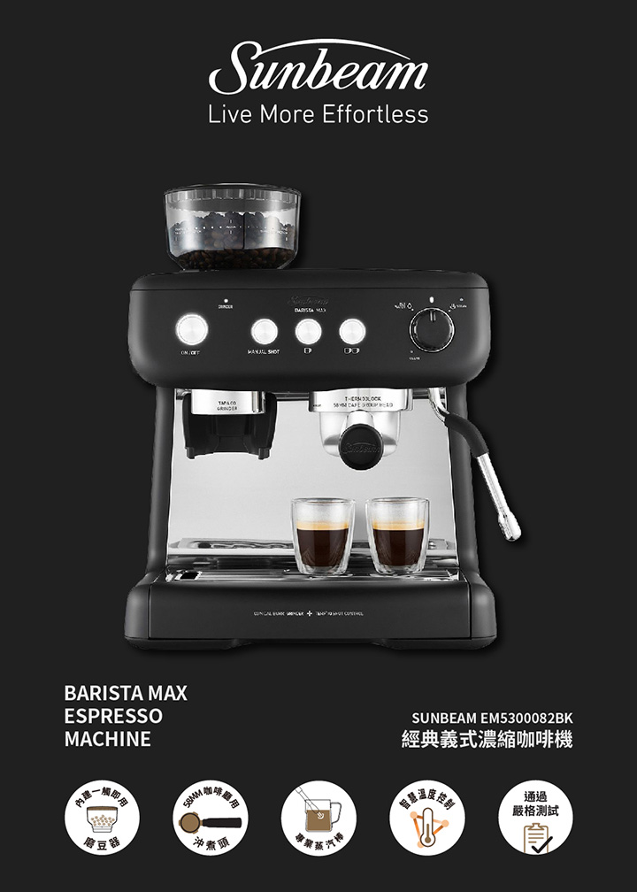品名:【Sunbeam】經典義式濃縮咖啡機顏色:碳鋼黑型號:EM5300082BK國際條碼:4895151561021製造:中國保固:1年商品尺寸:W348mm x H410mm x D322mm包裝尺寸:W366mm x H440mm x D396mm商品淨重:8.7 kg商品毛重:10 kg電壓功率:110V60Hz咖啡機消耗功率:1140W磨豆機消耗功率:120W豆槽容量:250g水箱容量:2800ml