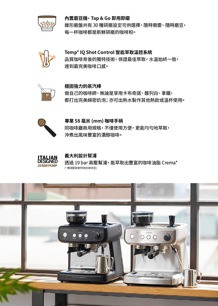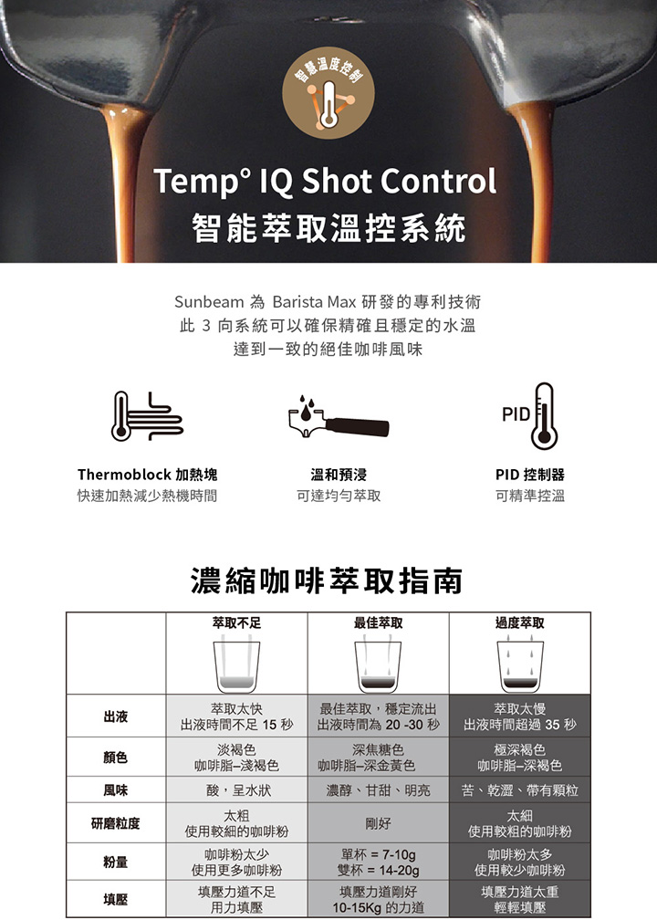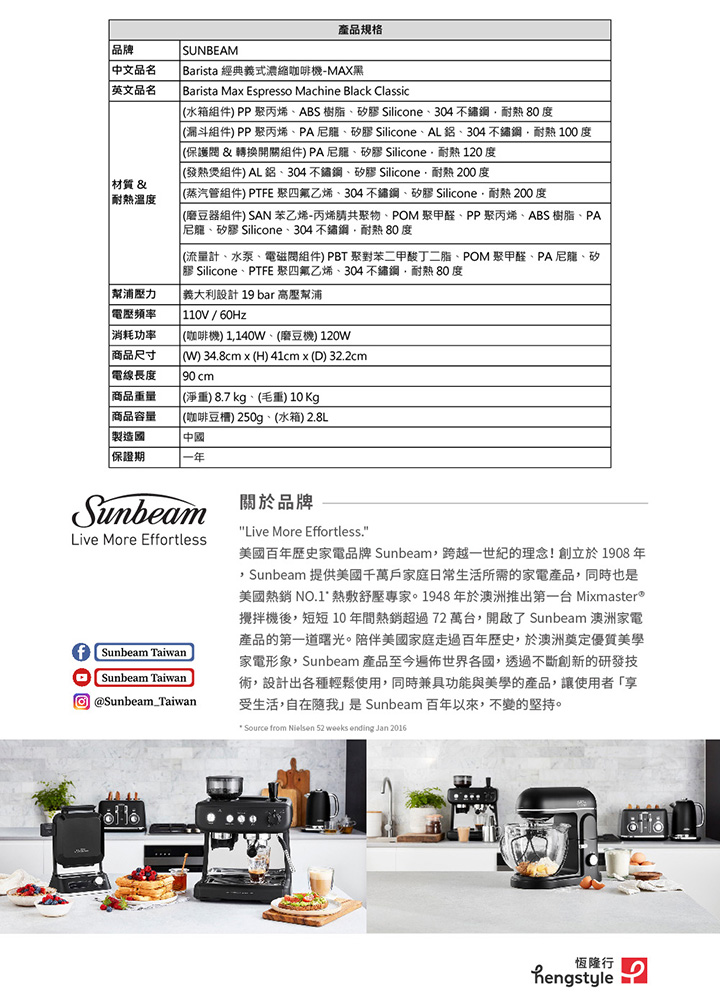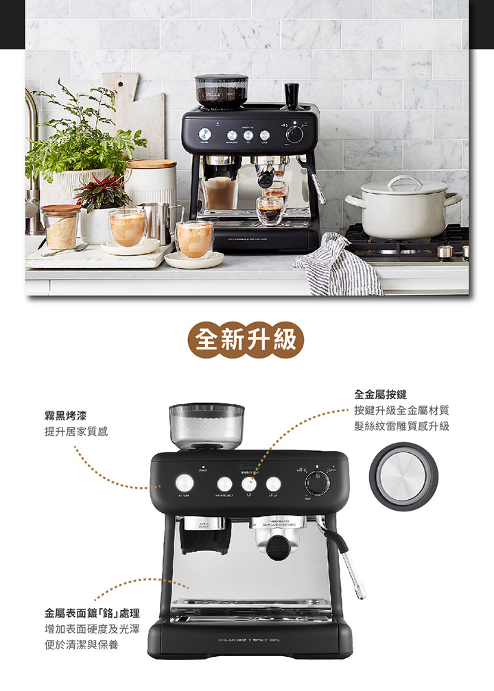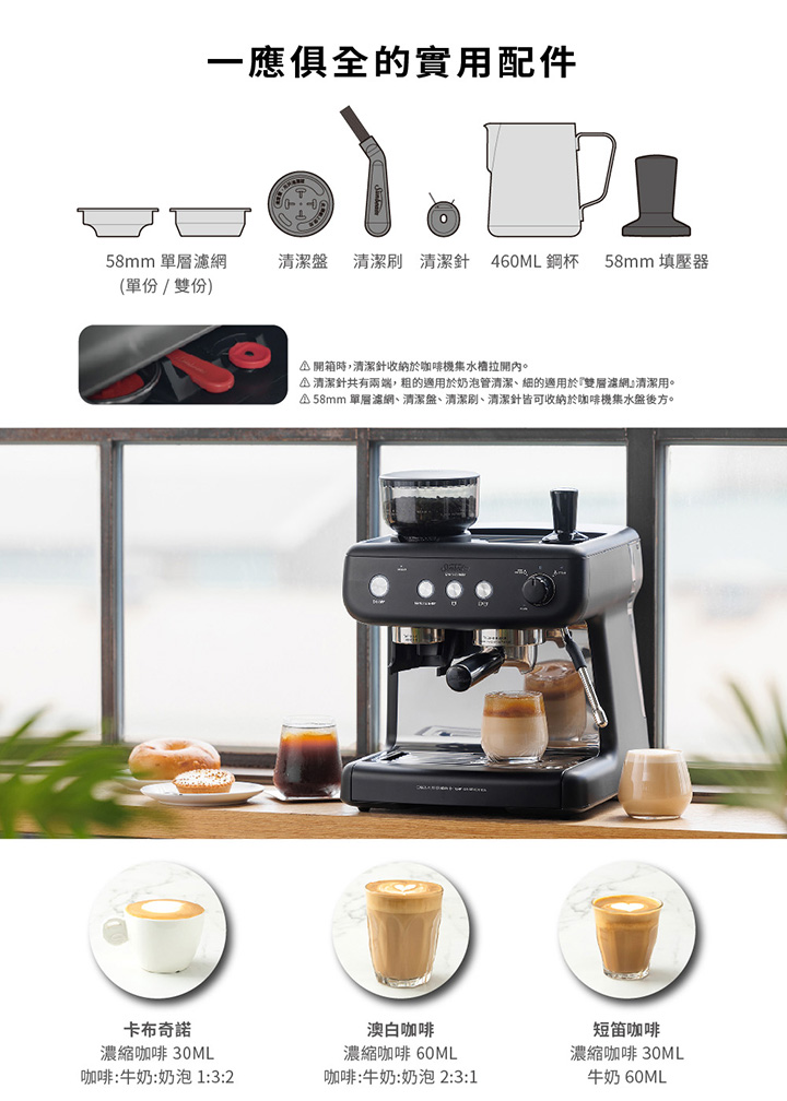 品名:【Sunbeam】經典義式濃縮咖啡機顏色:碳鋼黑型號:EM5300082BK國際條碼:4895151561021製造:中國保固:1年商品尺寸:W348mm x H410mm x D322mm包裝尺寸:W366mm x H440mm x D396mm商品淨重:8.7 kg商品毛重:10 kg電壓功率:110V60Hz咖啡機消耗功率:1140W磨豆機消耗功率:120W豆槽容量:250g水箱容量:2800ml