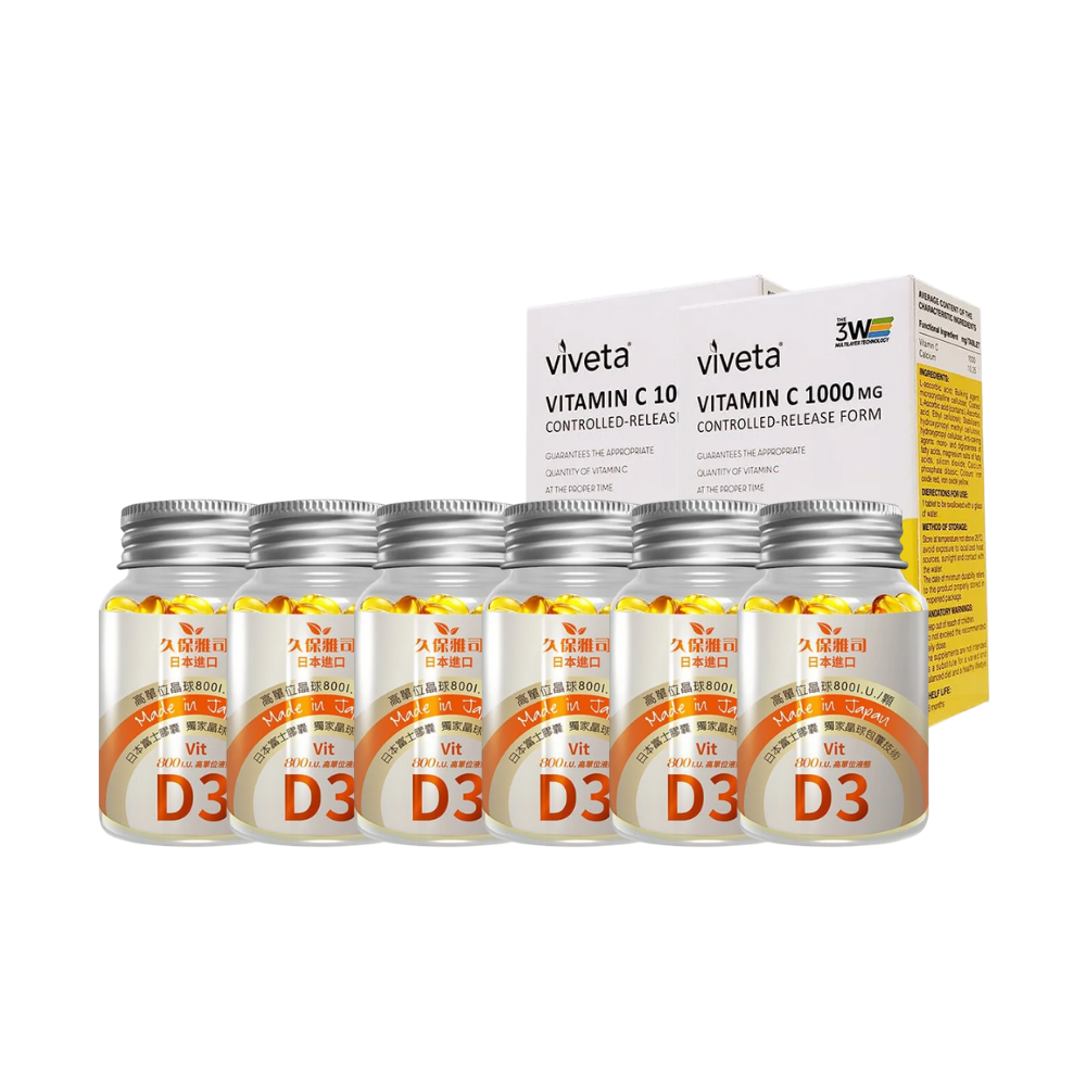 規格:富士集團維他命D3晶球x6瓶、高吸收長效抗氧化維他命Cx2盒