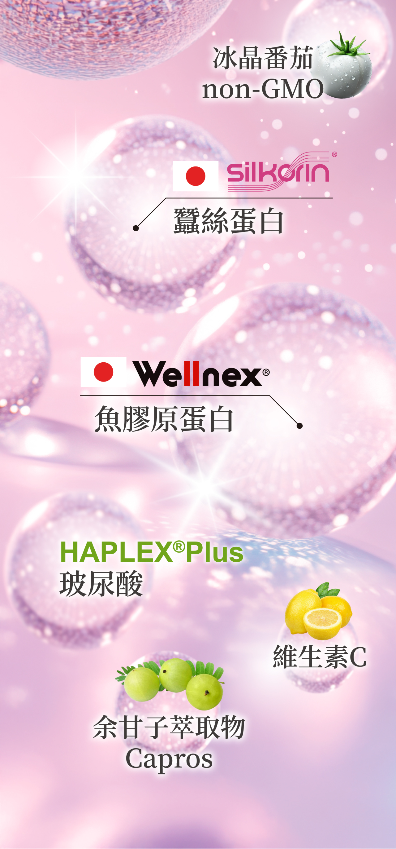 成分:膠原蛋白、葡萄糖、玉米澱粉、阿拉伯膠、洛神花精粉[含洛神花萃取物、麥芽糊精、氧化澱粉(樹薯)]、蠶絲蛋白(含蠶絲蛋白、樹薯糊精)、磷酸氫鈣、二氧化矽、維生素C、ProbEX、余甘子萃取物(含余甘子萃取物、麥芽糊精、氯化鈉、二氧化矽)、流行鏈球菌發酵物Streptococcus equi subsp. zooepidemicus(含透明質酸鈉)、DL-蘋果酸、香料(含丙二醇、酒精、水、香料)、檸檬酸、番茄萃取物、蔗糖素(甜味劑)。