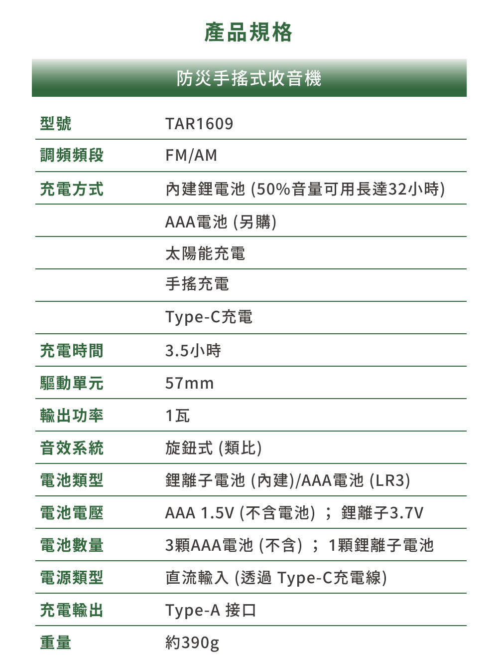 電池電壓:AAA 1.5 V (not include)、 Li-ion 3.7 V