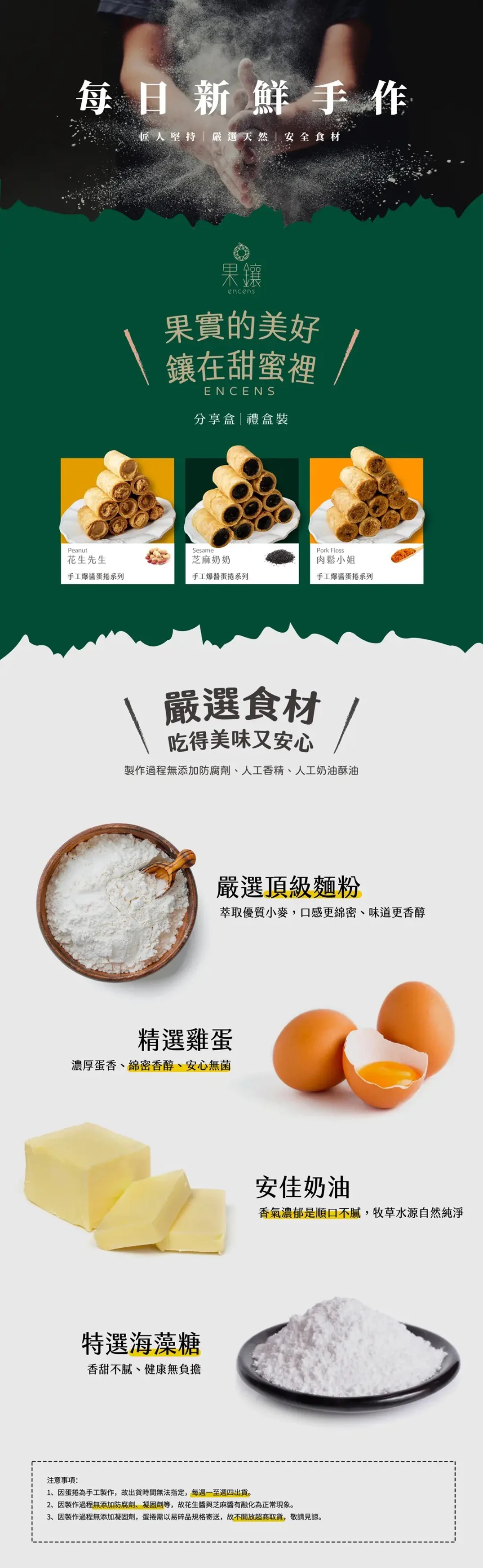 品名:【果鑲】手工爆醬蛋捲-榴蓮3盒組內容量:370克(一盒23捲)賞味期:三個月 (冷藏風味更佳)注意事項:因產品無添加防腐劑、凝固劑、香精料、色素、乳化劑,所以天氣溫度在25度以上時,建議請冷藏喔。