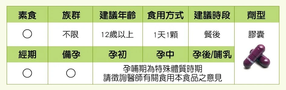 注意事項:1. 孕婦、嬰幼兒及特殊病症者,請依醫生指示食用。
