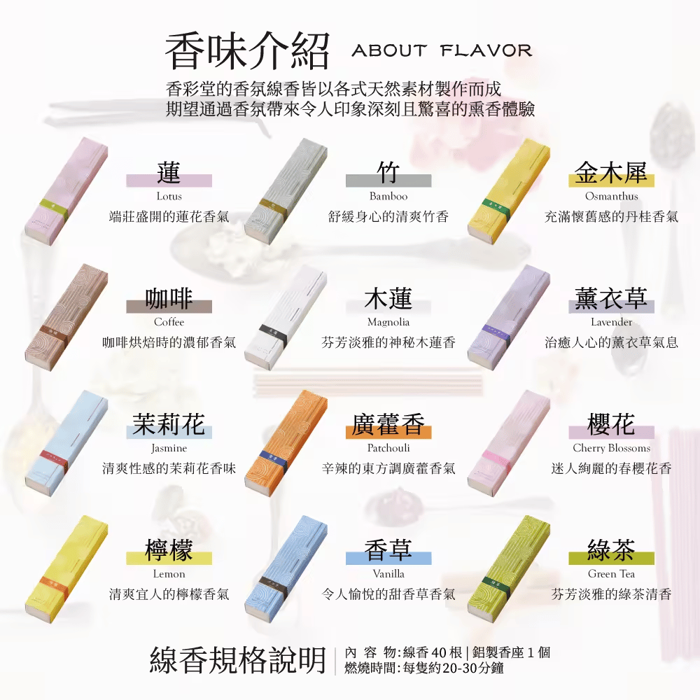 香味:薰衣草 / 茉莉花 / 金木犀 / 咖啡 / 木蓮 / 白檀 / 香草 / 櫻花 / 佛手柑 / 祕魯聖木 / 乳香 / 桃子 / 沉香