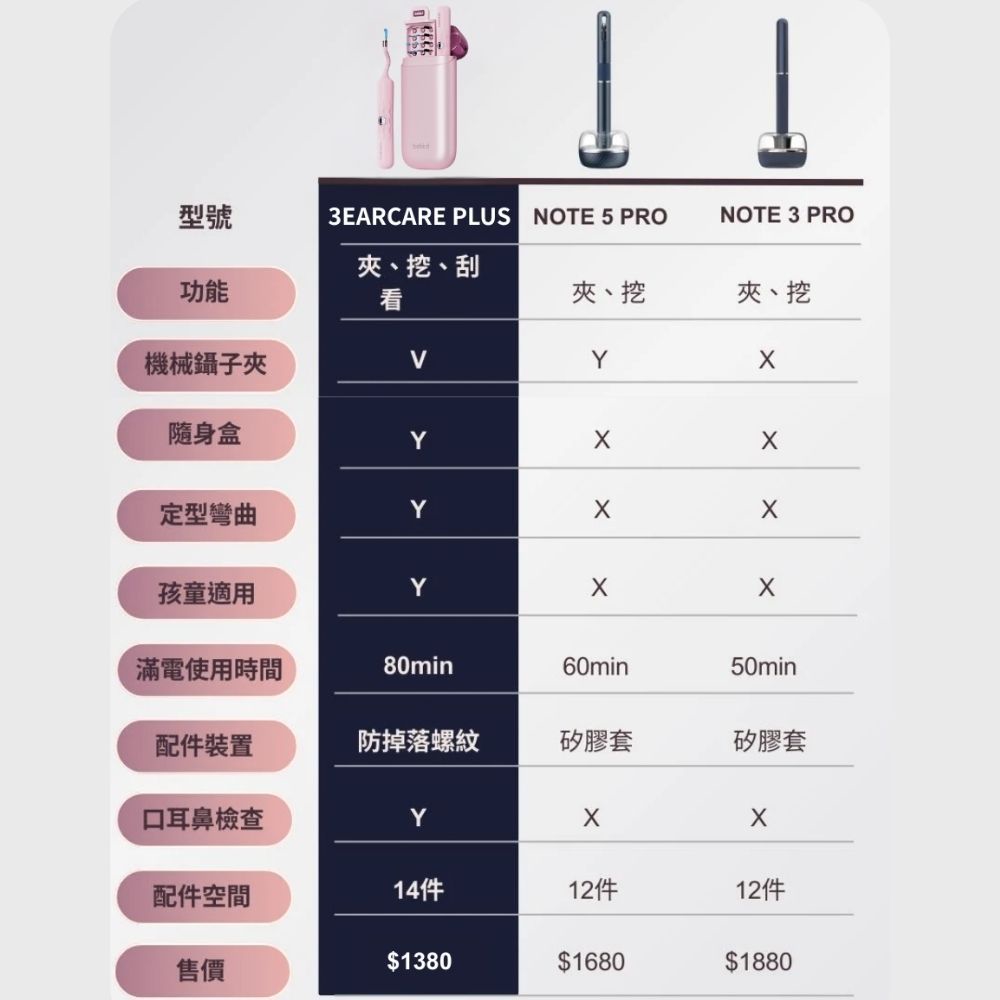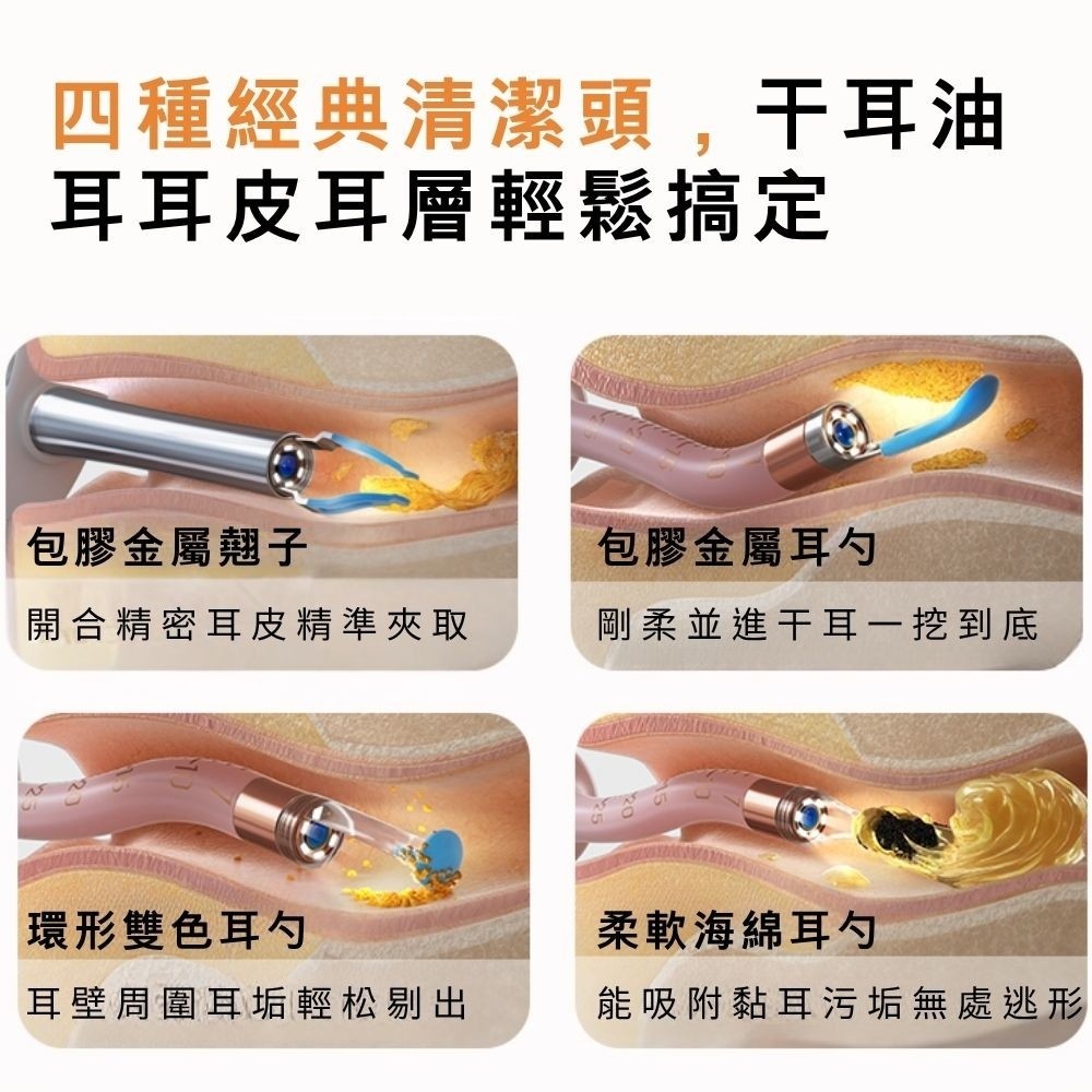 內容物:掏耳棒x1、配件盒x1、兒童專用耳勺x2、大人耳勺x2、鑷子x1、旋轉耳勺x2、海綿耳勺x4、口腔護塞x1、鼻腔護塞x1、耳朵護塞x1、清潔刷x1