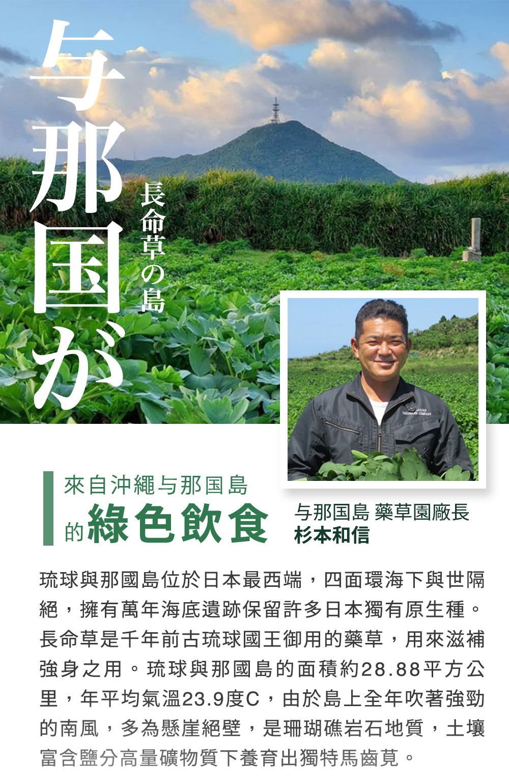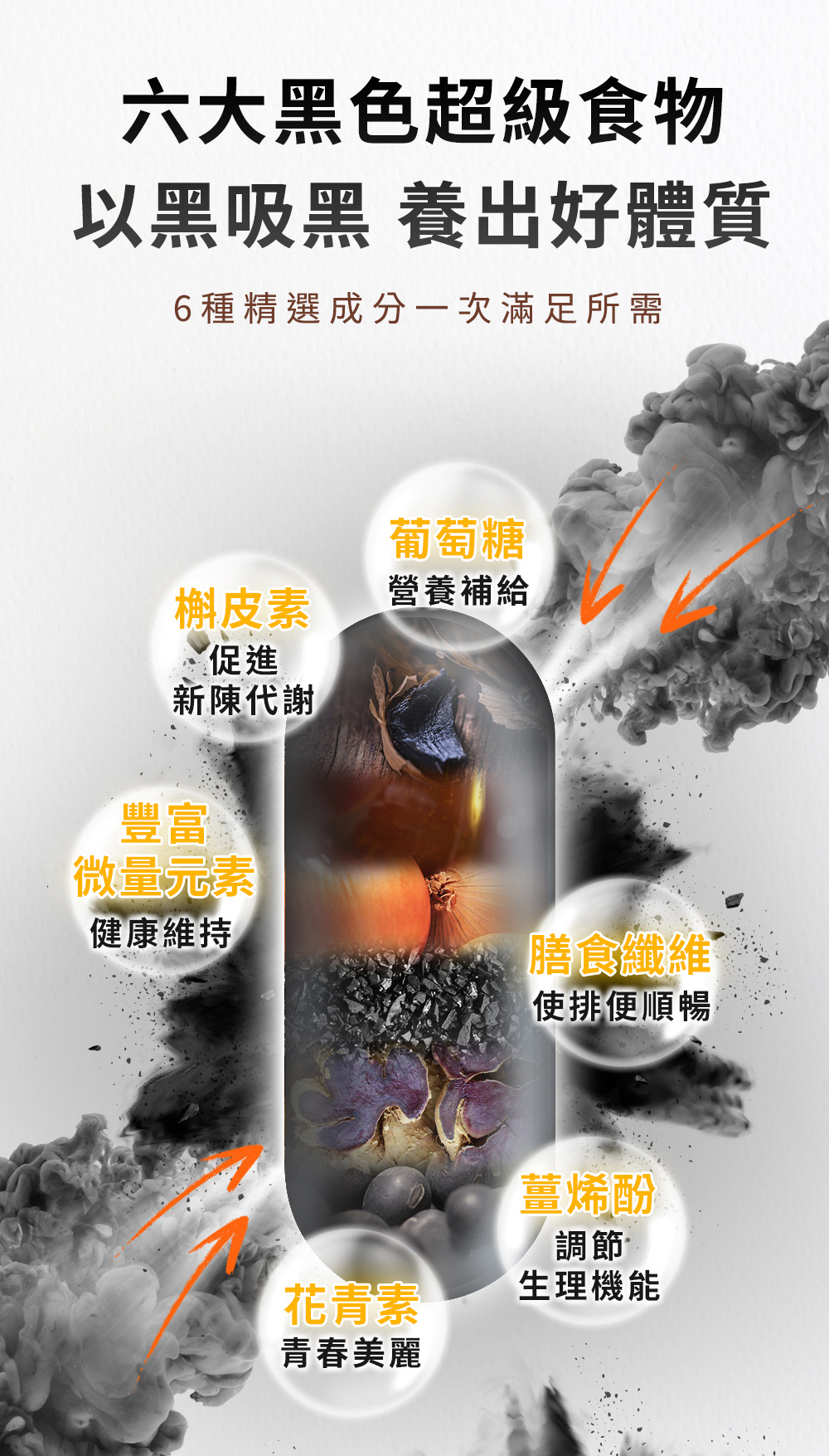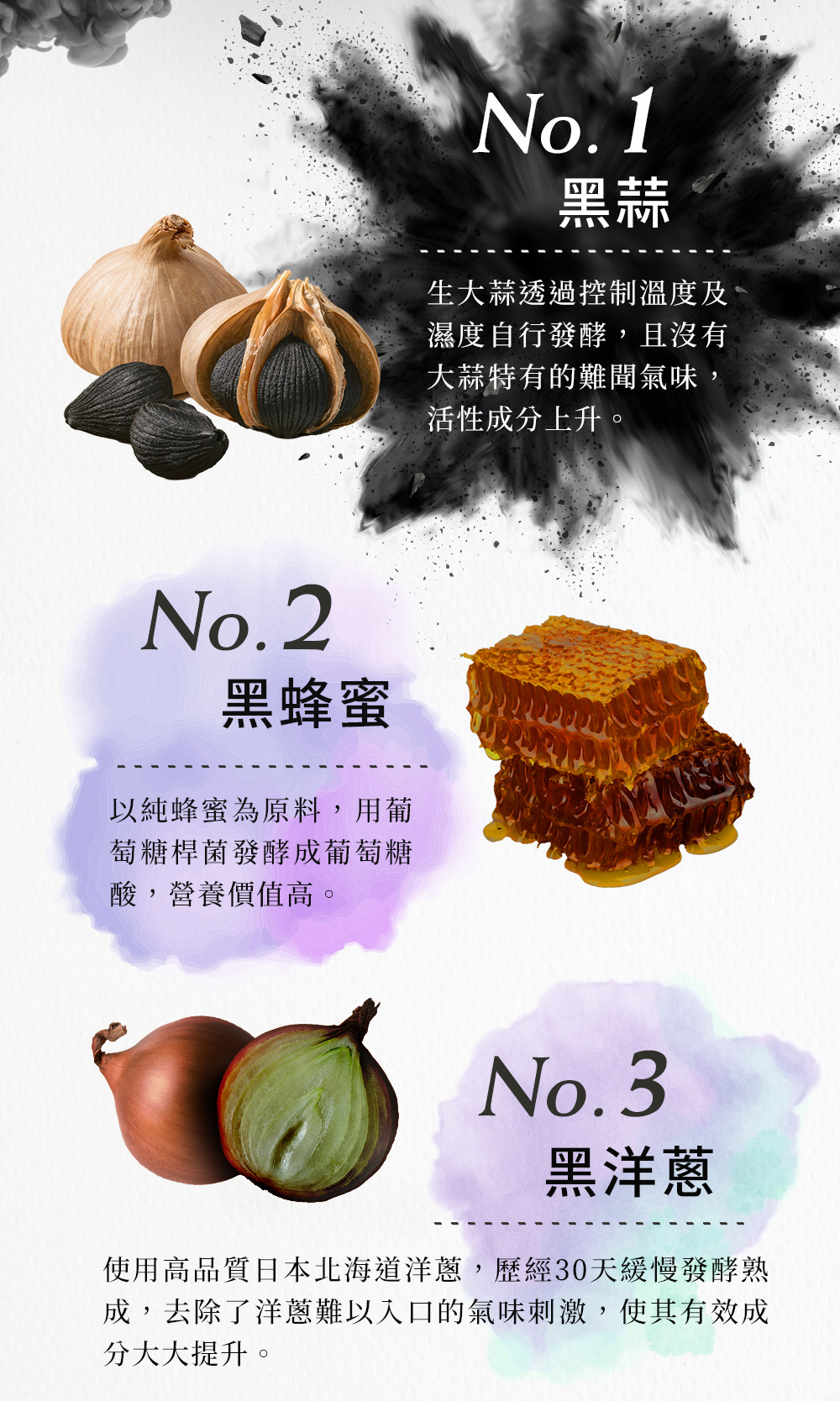 成分:微結晶狀α-纖維素、馬齒莧(Portulaca oleracea)、植物碳、宮崎山苦瓜濃縮粉(苦瓜濃縮液、糊精)、環狀糊精(Alpha-Cyclodextrin)、硬脂酸鈣、二氧化矽、硬脂酸鎂、乳糖、芽孢乳酸桿菌(Lactobacillus sporogenes)、黑薑粉、發酵黑蒜(自然發酵)、發酵黑洋蔥(醋酸菌Acetobacter aceti)、蜂蜜、糊精、黑豆萃取物。