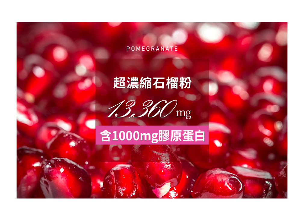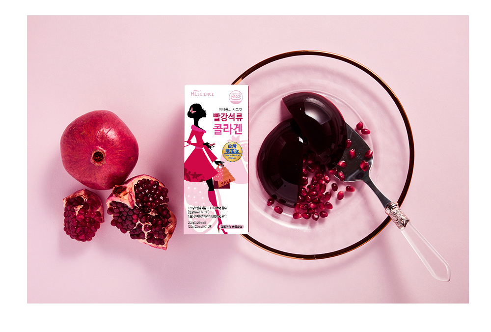 成分:石榴濃縮汁、菠蘿濃縮汁、魚膠原蛋白、黑醋栗汁、刺槐豆膠(刺槐豆膠、玉米糖膠、洋菜、羅望子膠、鹿角菜膠、氯化鉀)、石榴香料、檸檬酸鈉、無水檸檬酸、氯化鎂、大茴香子、焦磷酸鐵、蔗糖素(甜味劑)、彈性蛋白(魚皮)、石榴濃縮粉末、維生素C(抗氧化劑)、生物素(磷酸氫鈣、生物素)、萊姆萃取粉、花椰菜萃取粉
