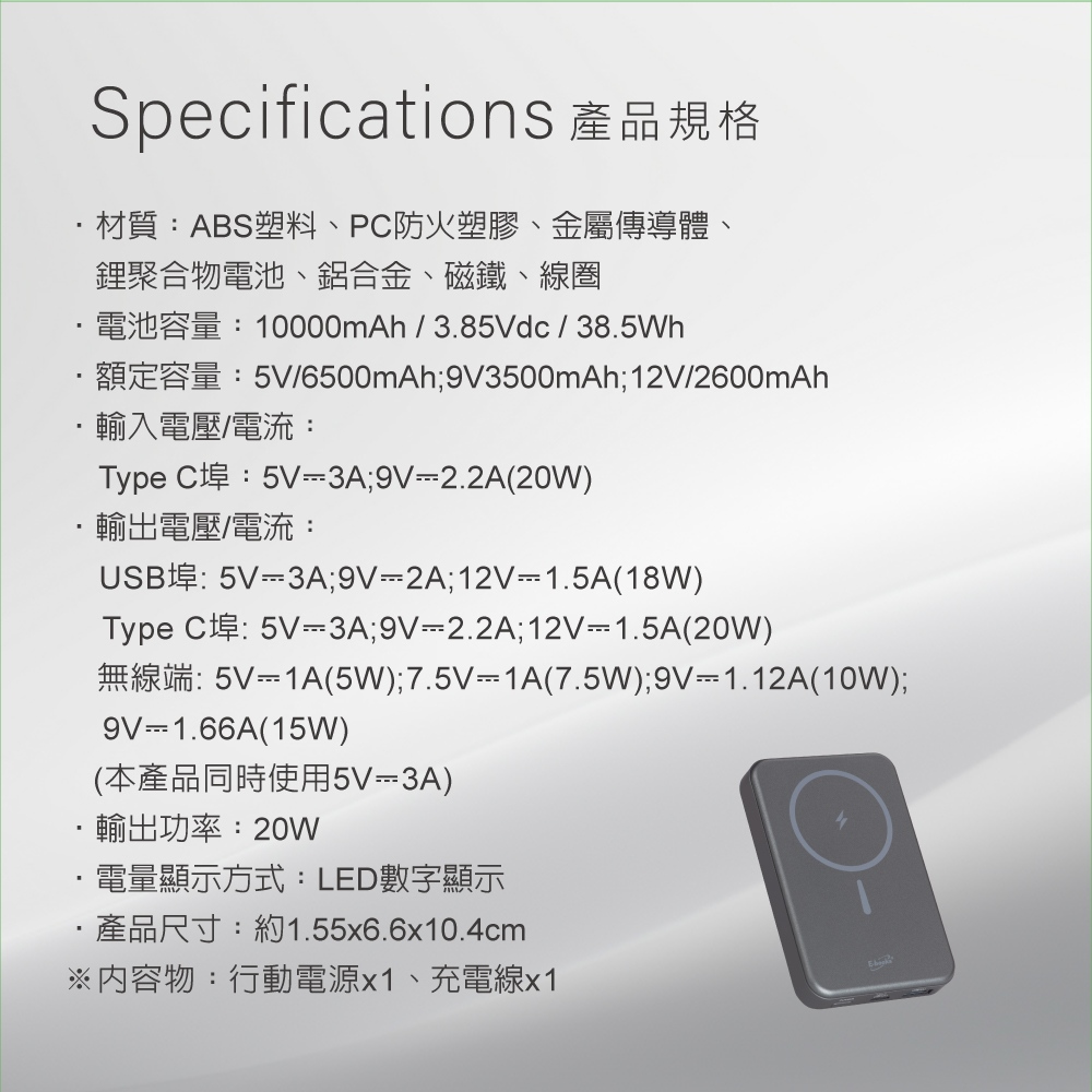 Type C埠: 5V⎓3A;9V⎓2.2A;12V⎓1.5A(20W)
