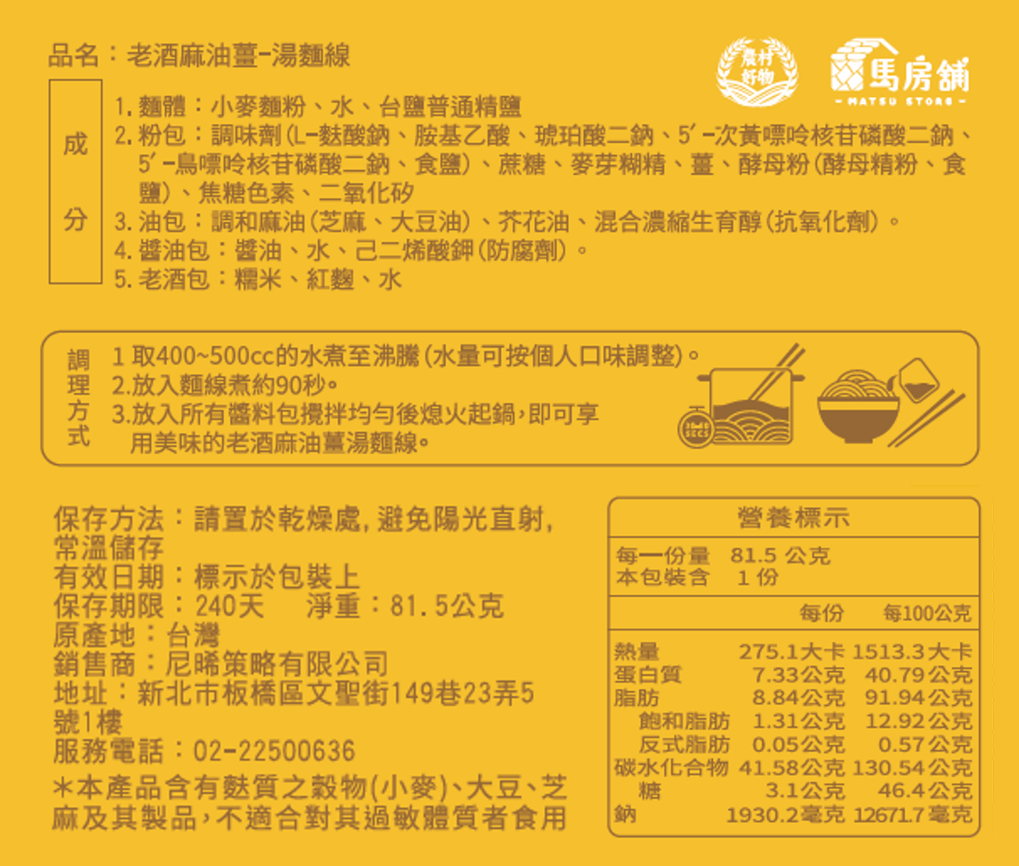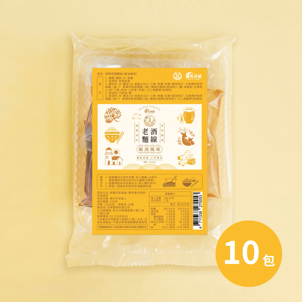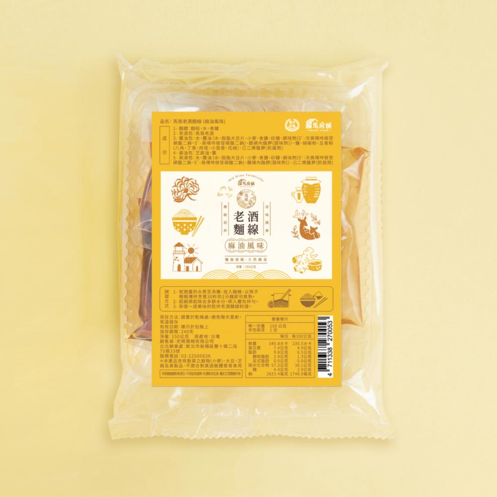 馬祖的老酒麵線在馬祖當地算是道月子餐,可想而知它是道非常的溫補的料理!湯內老酒香氣非常醇香,喝一口全身都暖和了起來,而麵線是店家請人特製的,非常非常的細緻,而整個麵線吸附了湯汁後,吃起來是綿密又滑順的口感,非常的特別!麵線最常遇到的問題是:(1.) 長條型很難包裝與攜帶 (2.)不易保存容易潮濕變質。為了解決以上的問題,馬房舖馬祖老酒麵線以封存的方式,加上特色研發的高湯粉包、麻油包、醬油包以及馬祖獨特有的靈魂主角『馬祖老酒』酒包做為四合一的組合式商品,包裝上則以文創簡約並帶入馬祖當地特色的方式來強化給人帶來的簡單美味的印象。