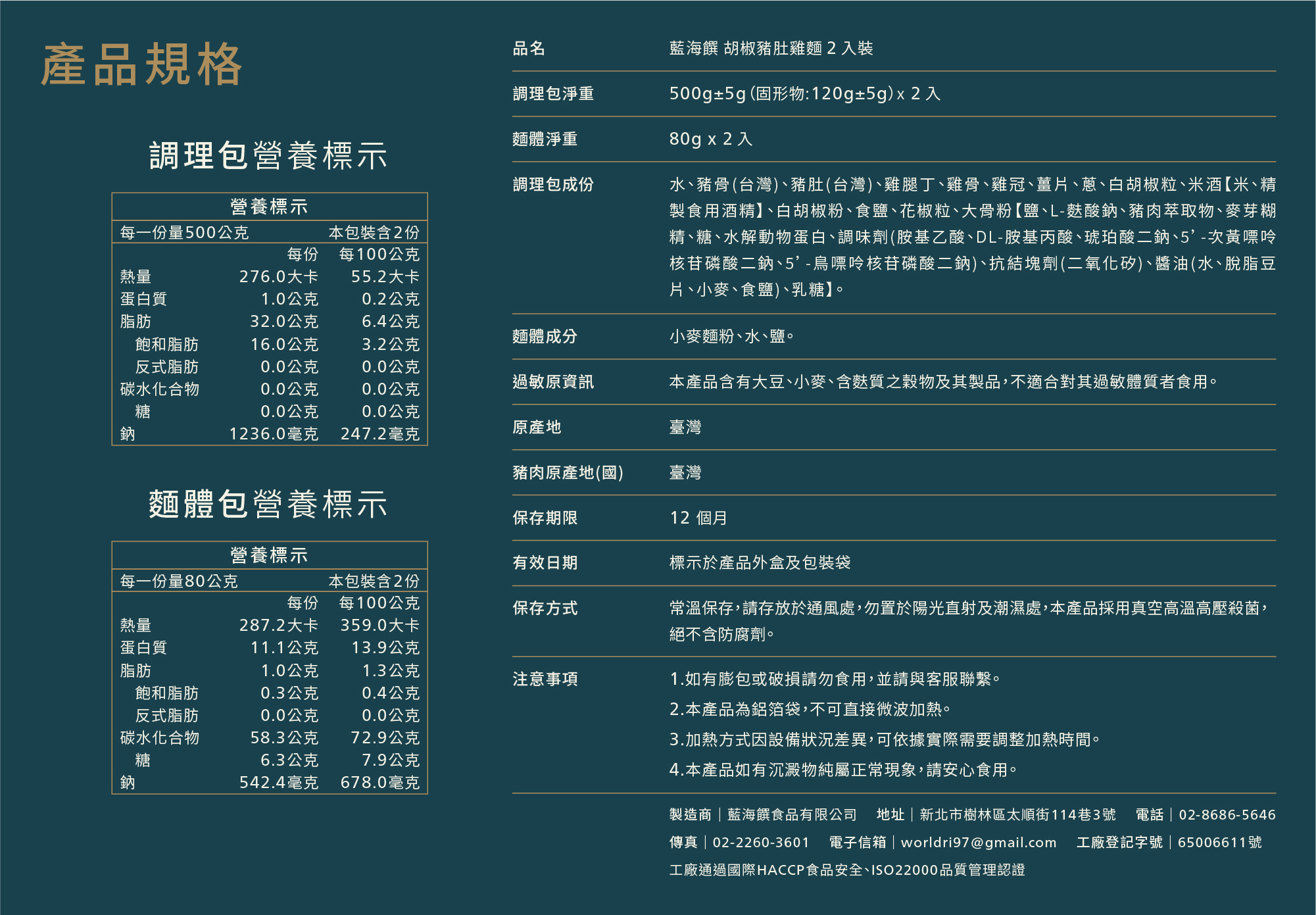 品名:【藍海饌】胡椒豬肚雞麵2入裝調理包淨重:500±5g(固形物120g±5g)x2入成分:詳見外包裝標示原產地:台灣豬肉原產地:台灣保存期限:12個月保存方式:常溫保存,請存放於通風處,勿置於陽光直射及潮濕處,本產品採用真空高溫高壓殺菌,絕不含防腐劑。注意事項:1.如有膨包或破損請勿食用,並請與客服聯繫。 2.本產品為鋁箔袋,不可直接微波加熱。 3.加熱方式因設備狀況差異,可依據實際需要調整加熱時間。 4.本產品如有沉澱物純屬正常現象,請安心食用。