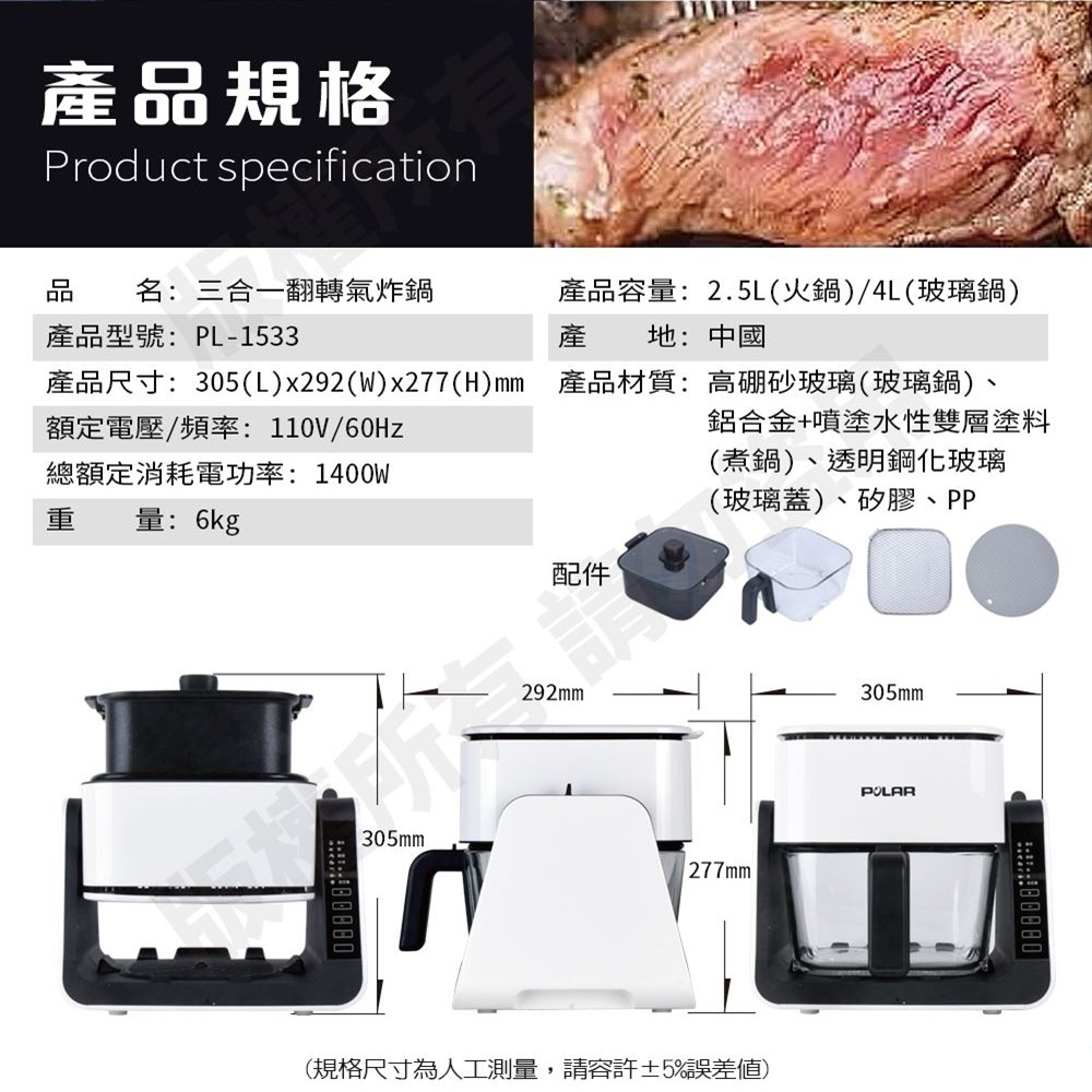 品名:【普樂 Polar】三合一翻轉氣炸鍋(PL-1533)
