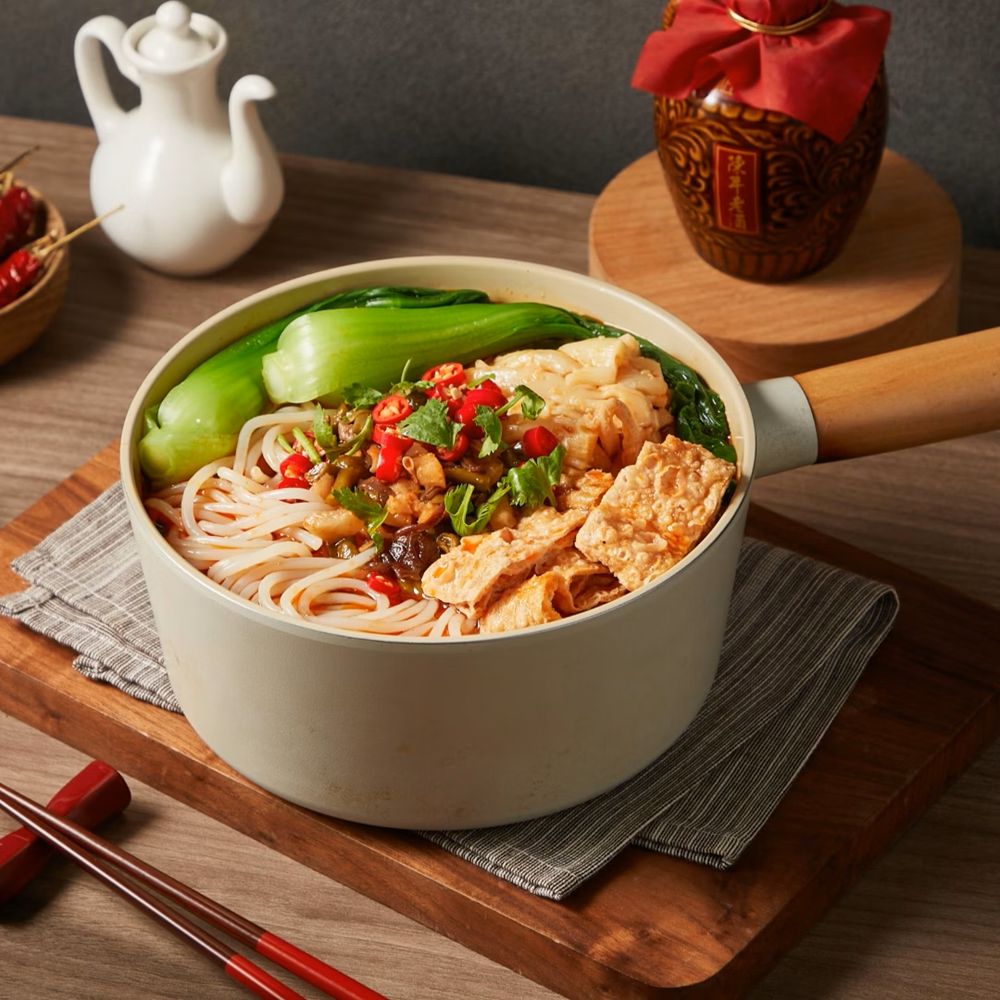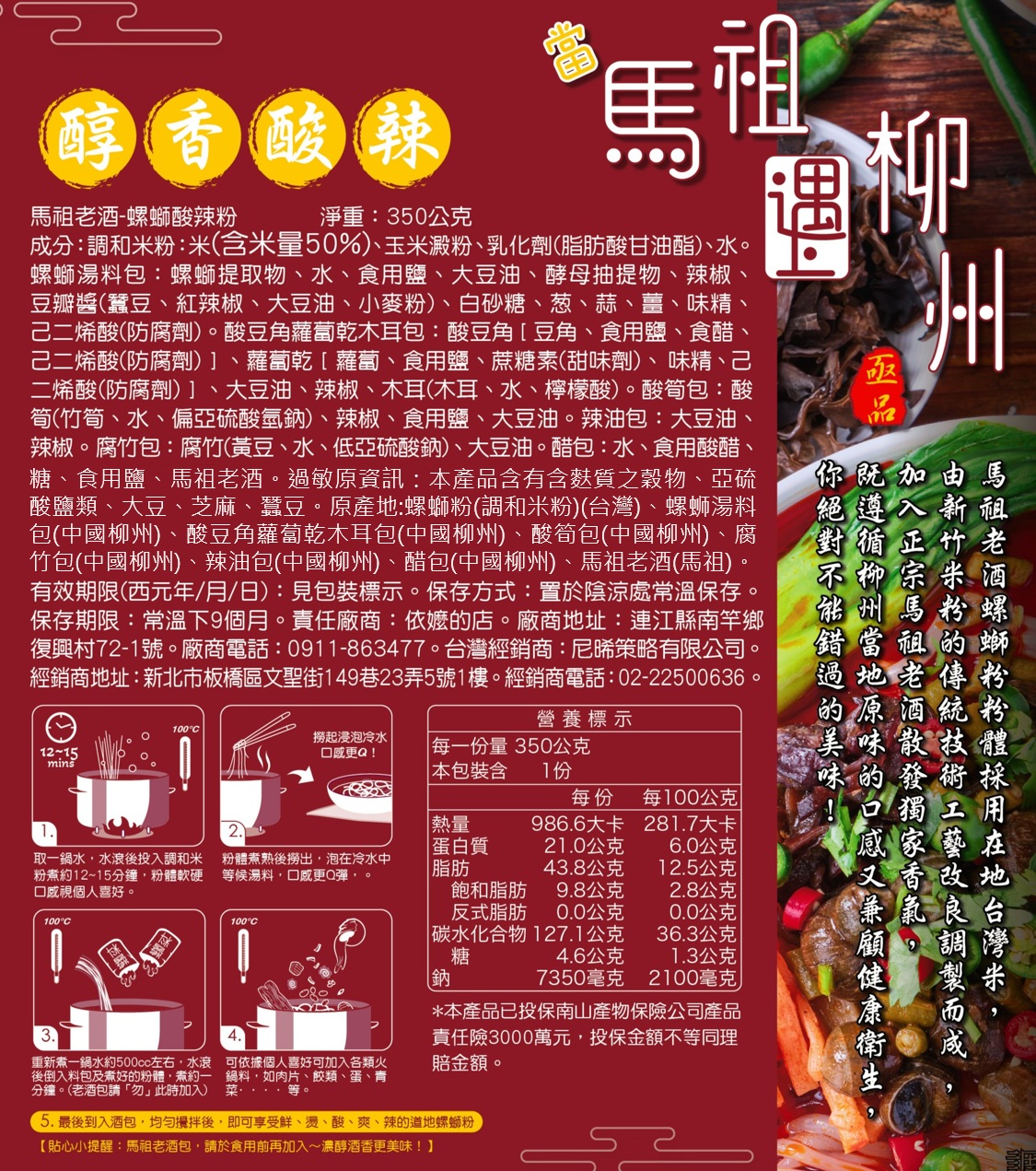 正宗柳州螺螄靈魂湯頭,台灣米製造螺螄粉米線,加入馬祖老酒獨家香氣,味濃、麵Q、酸辣爽,選用含米量高達50%的調和米粉,以傳統工藝自然晾曬,粉量更增30%,將原料從柳州合法運送來台,再加上酸豆角、蘿蔔乾、木耳、酸筍、腐竹、辣油、醋等經典配料,烹調後倒入馬祖老酒包,香氣更迷人。包包超享受,每一口都不容錯過。