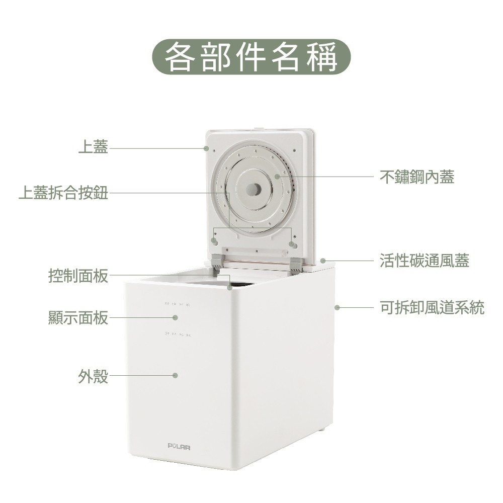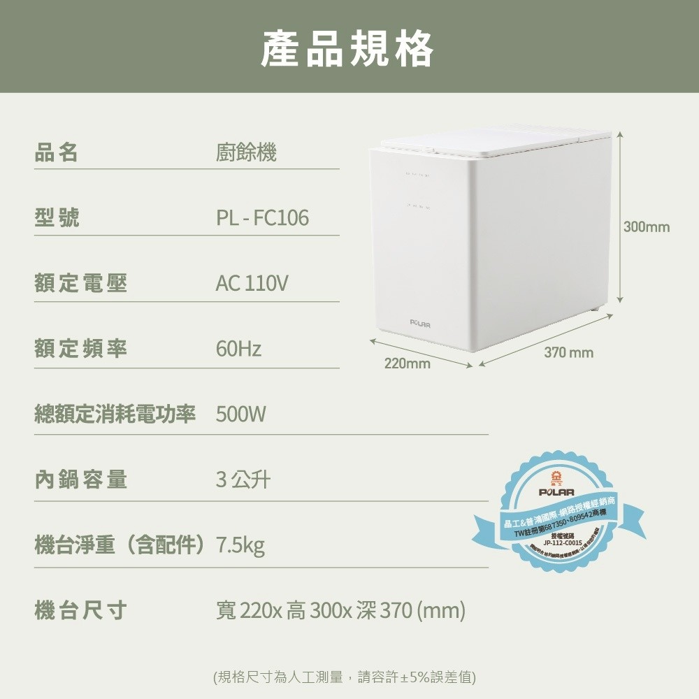 品名:【普樂 Polar】廚餘機 3L型號:PL-FC106容量:3L功率:500W電壓/頻率:110V/60Hz運轉音量:≦40dB商品尺寸:22x30x37cm商品淨重:7.5kg保固:1年產地:中國