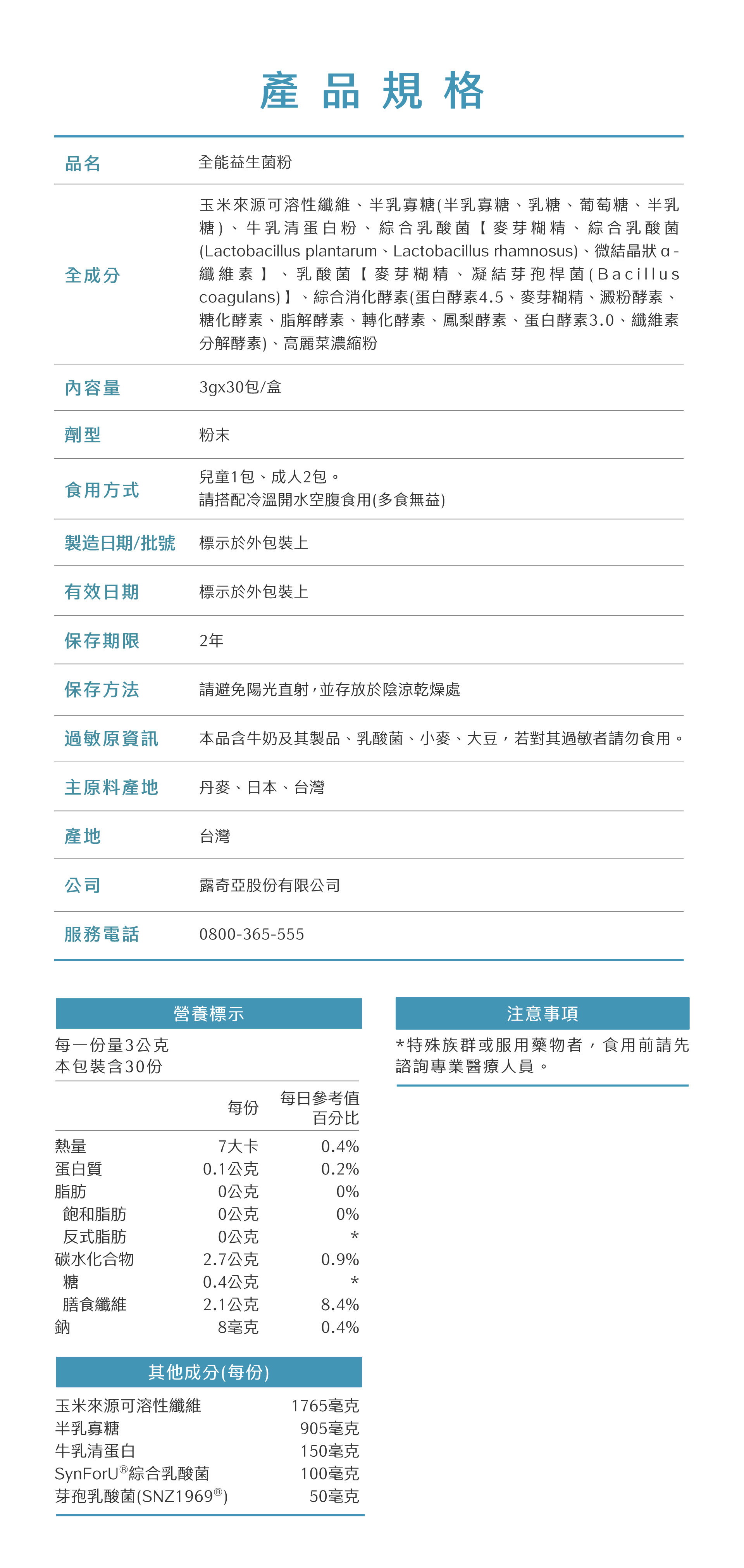 成分:玉米來源可溶性纖維、半乳寡糖(半乳寡糖、乳糖、葡萄糖、半乳糖)、牛乳清蛋白粉、綜合乳酸【麥芽糊精、綜合乳酸菌(Lactobacillus plantarum-Lactobacillus rhamnosus)、微結晶狀a-纖維素】、乳酸菌【麥芽糊精、凝結芽孢桿菌(Bacillus coagulans)】、綜合消化酵素(蛋白酵素4.5、麥芽糊精、澱粉酵素、糖化酵素、脂解酵素、轉化酵素、鳳梨酵素、蛋白酵素3.0、纖維素分解酵素)、高麗菜濃縮粉