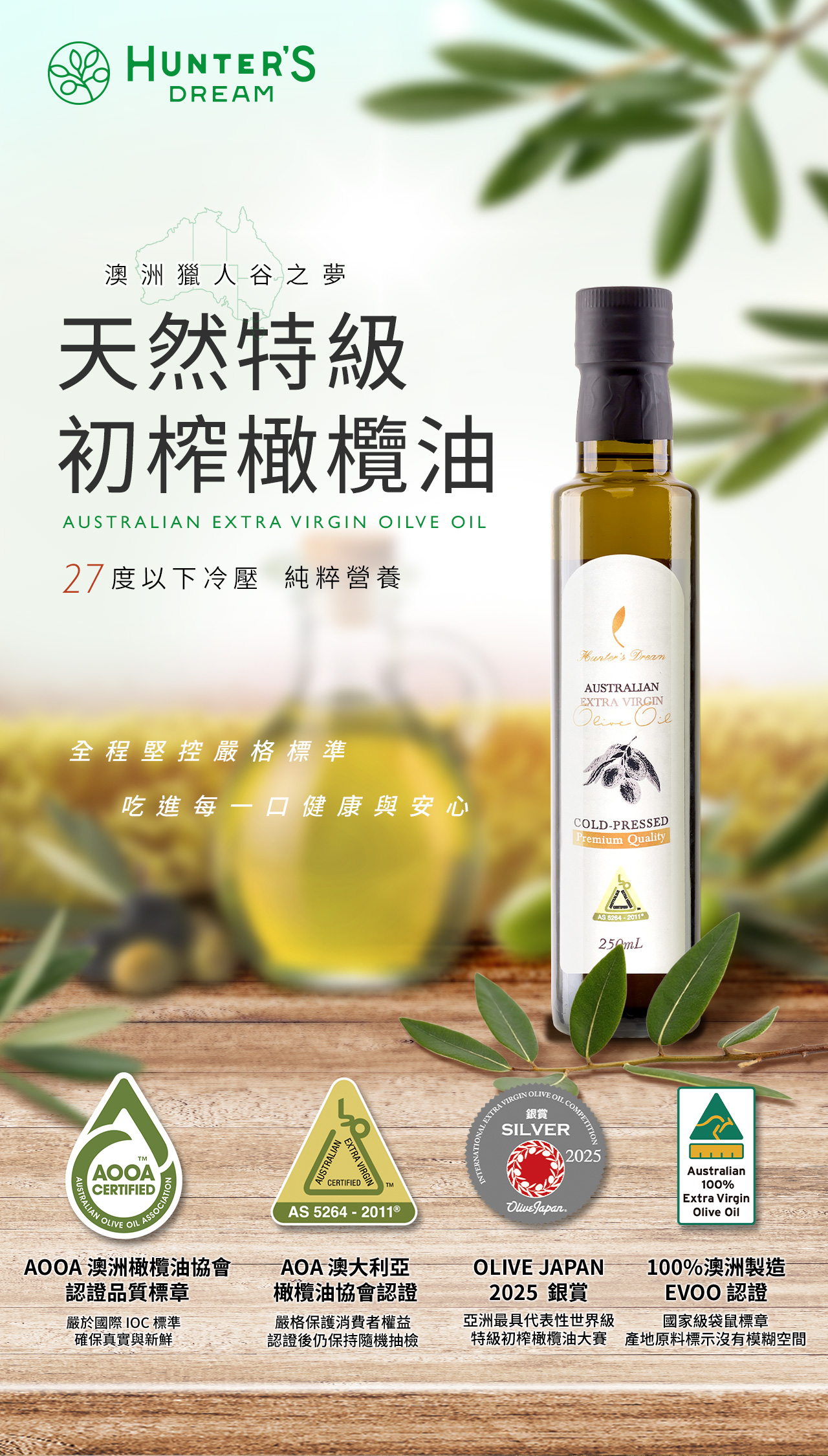 品名:【獵人谷之夢】澳洲天然特級初榨橄欖油規格:250ml(裸瓶)/500ml(盒裝)成分:100%橄欖油產地:澳洲原裝進口酸價:低於0.2%保存期限:兩年有效期限:標示於包裝袋上(西元年/月/日)保存方法:請避免陽光直射,置於陰涼乾燥處,開封後請盡速食用注意事項:無需冷藏,如冷藏產生霧狀凝結為正常現象,並不影響品質,請安心食用